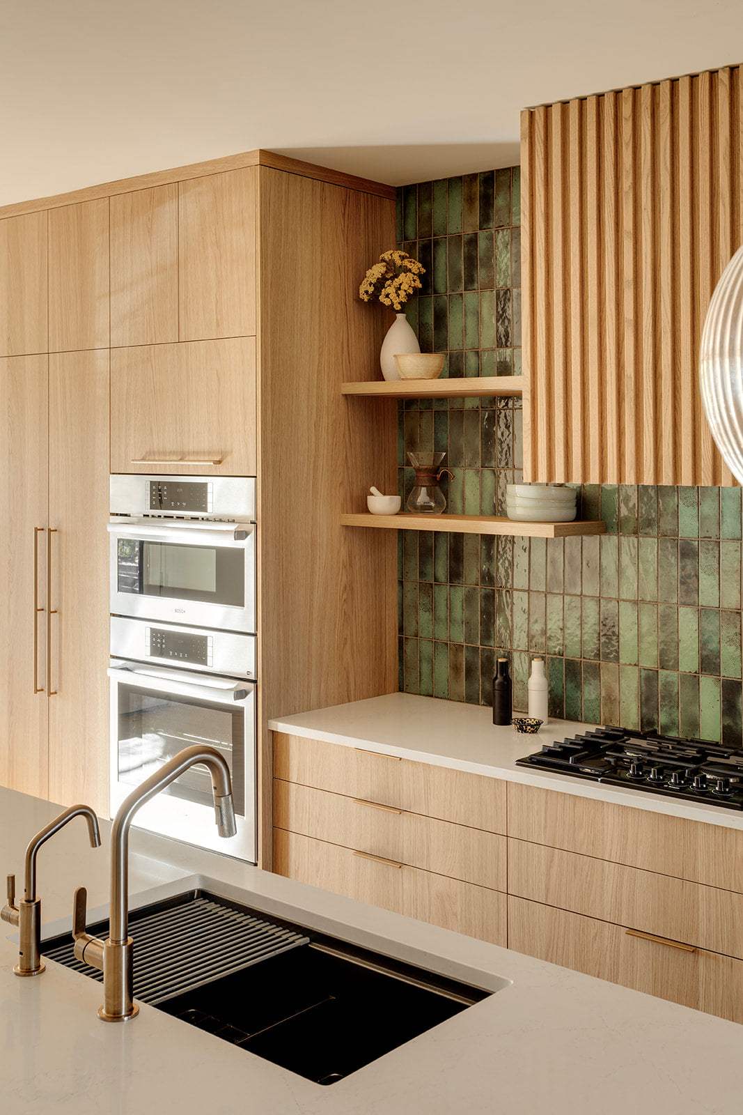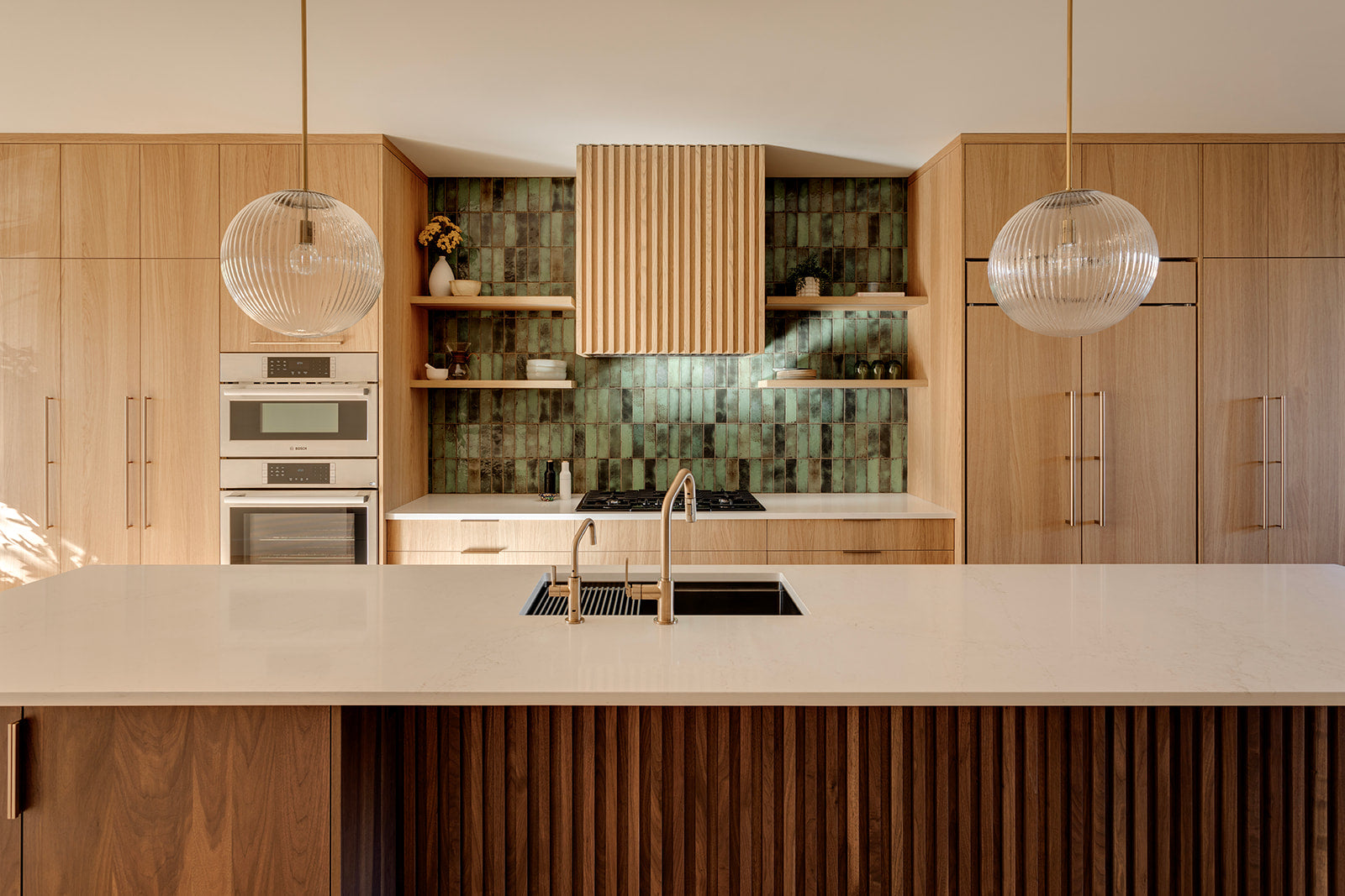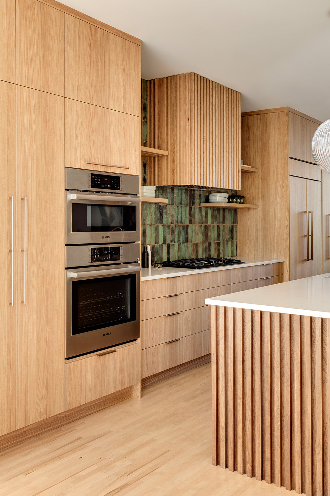 To achieve this vision Erin, Principal Designer of EF Interiors, centered the design around a balanced interplay of earthy textures, natural materials, and streamlined organization. Tall, floor-to-ceiling cabinetry, in Shinnoki Natural Oak, now flanks the space, housing integrated appliances—including a paneled refrigerator, wall ovens, and a hidden broom closet—ensuring a clutter-free aesthetic. A statement gas range takes center stage beneath a custom tambour-stained hood vent, echoing the warm, organic tones found throughout the home. The island, finished in Shinnoki Smoked Walnut and detailed with tambour paneling, introduces a rich contrast, further emphasized by its accent cabinetry in Benjamin Moore’s Dark Olive. The Caesarstone countertops lend a soft, luminous quality with delicate amber veining, while the backsplash adds a jewel-like depth, creating an eye-catching, textural focal point.