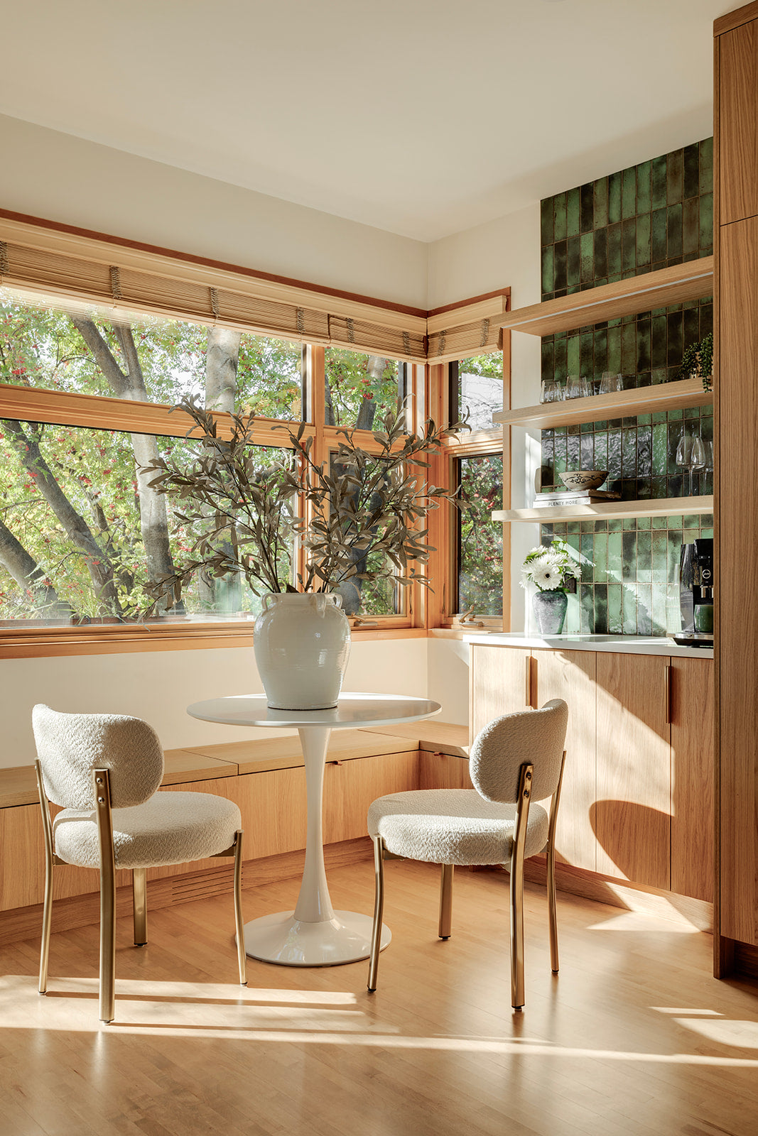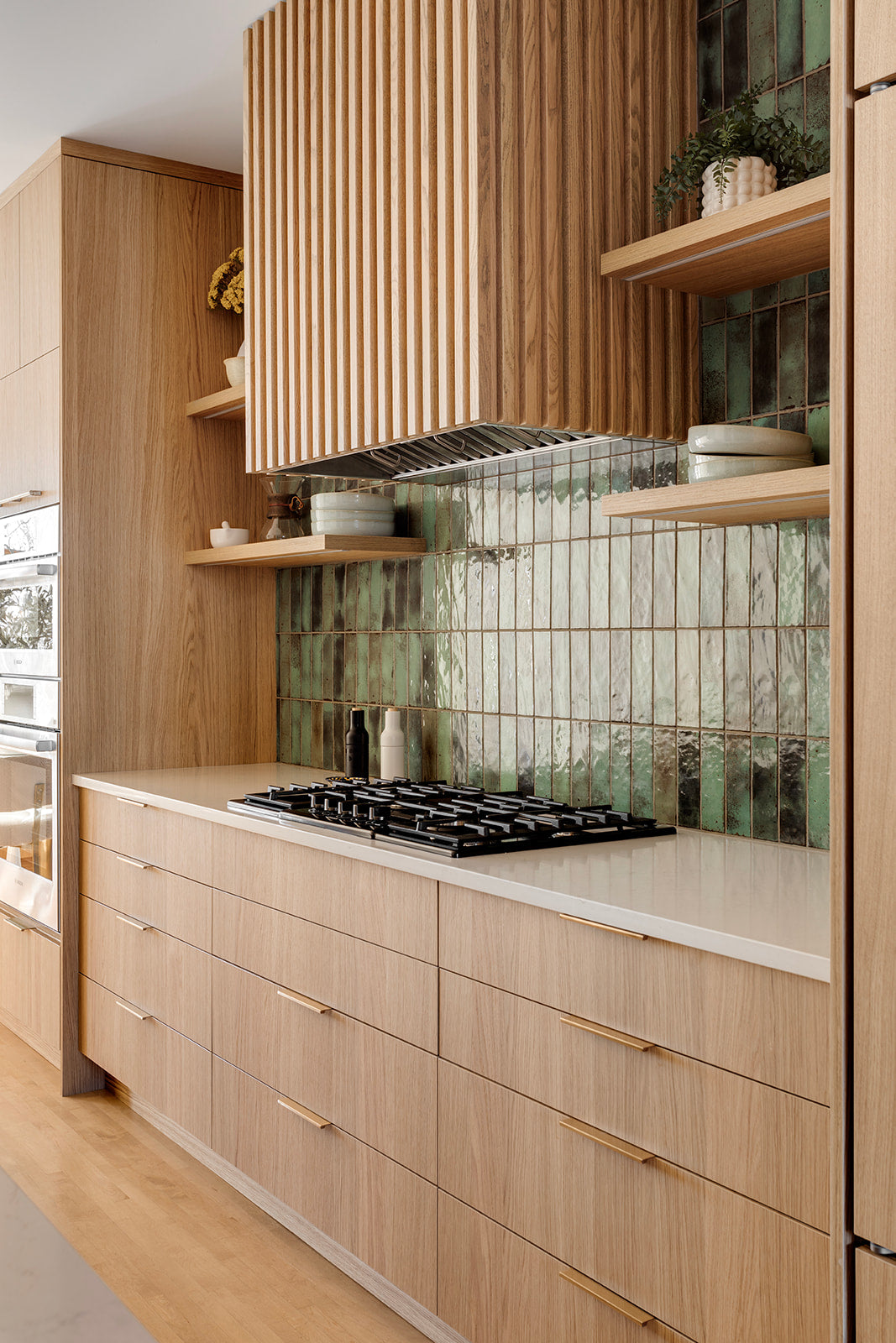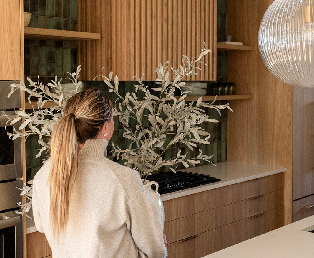 To achieve this vision Erin, Principal Designer of EF Interiors, centered the design around a balanced interplay of earthy textures, natural materials, and streamlined organization. Tall, floor-to-ceiling cabinetry, in Shinnoki Natural Oak, now flanks the space, housing integrated appliances—including a paneled refrigerator, wall ovens, and a hidden broom closet—ensuring a clutter-free aesthetic. A statement gas range takes center stage beneath a custom tambour-stained hood vent, echoing the warm, organic tones found throughout the home. The island, finished in Shinnoki Smoked Walnut and detailed with tambour paneling, introduces a rich contrast, further emphasized by its accent cabinetry in Benjamin Moore’s Dark Olive. The Caesarstone countertops lend a soft, luminous quality with delicate amber veining, while the backsplash adds a jewel-like depth, creating an eye-catching, textural focal point.