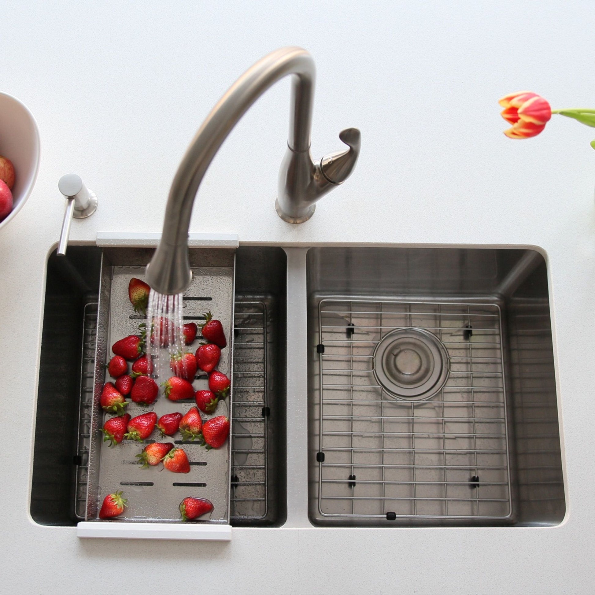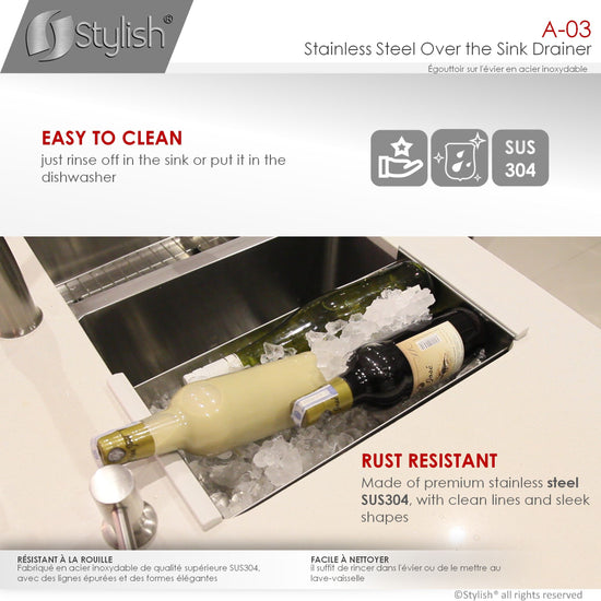 Stainless Steel over the sink colander is designed to match your sink, drain fast and sturdy to hold heavy items. It is constructed from premium quality solid SUS 304 stainless steel for maximum durability and performance. This colander is a great helping hand while preparing food as it can rest over the sink opening and can be used for multiple purposes like rinsing and washing vegetables, draining pasta, drying cutlery and plates. The colander has the ideal size for 17 inches sink opening front to back, it is designed to fit with overhang or reveal sink mount, see product listing for specific dimensions where it can fit. The commercial grade satin finish and slot shapes match beautiful with most popular fixtures and appliances.