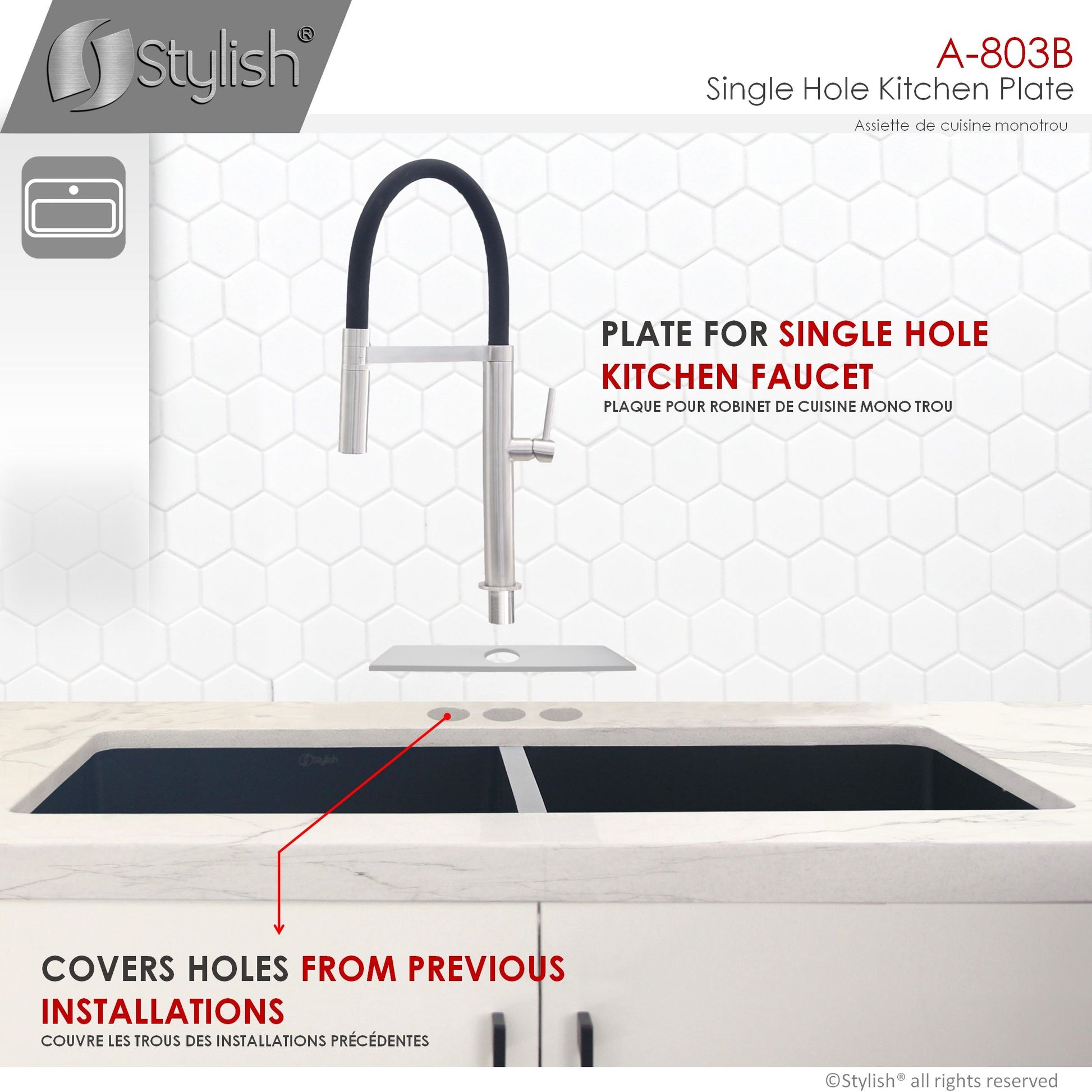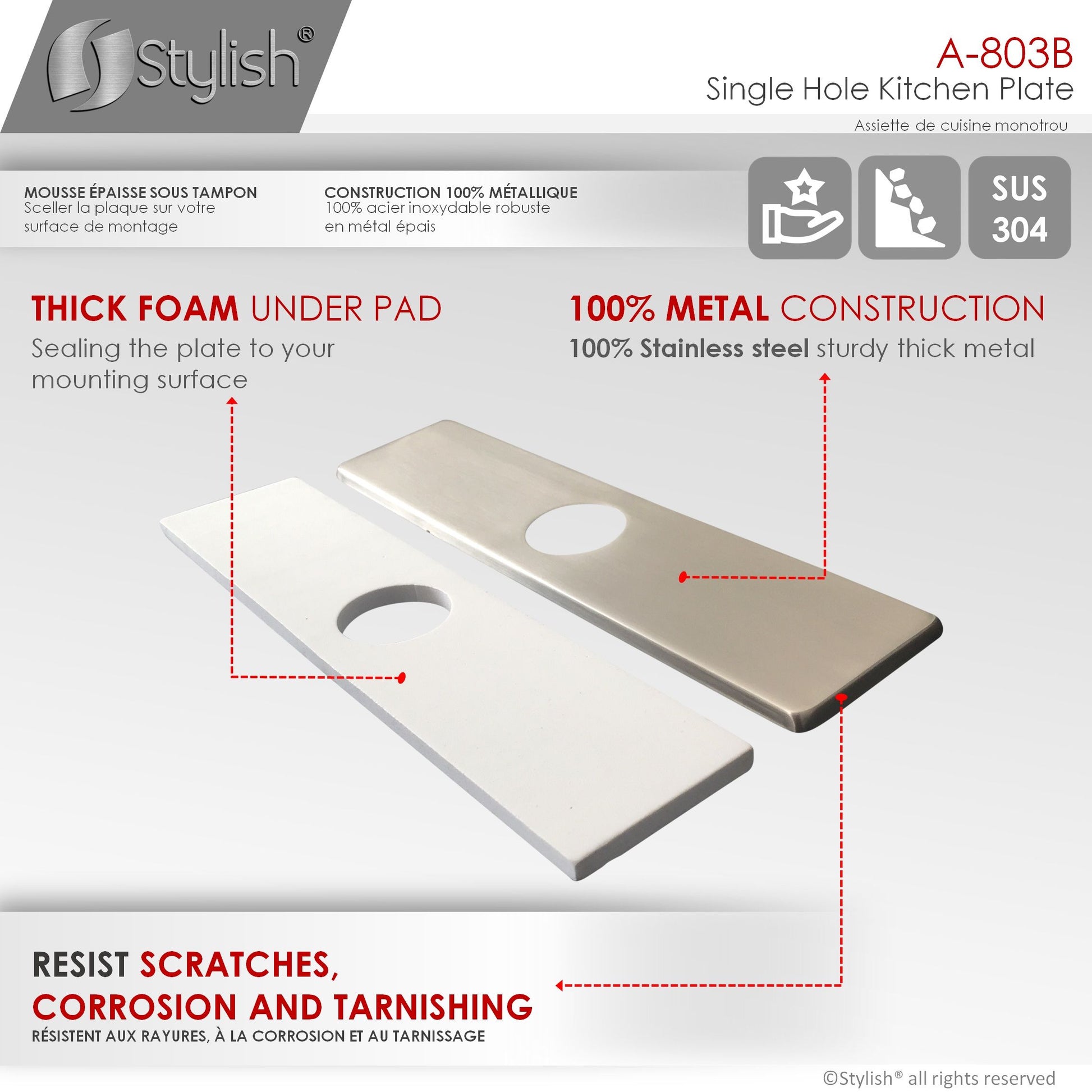 Create a seamless mounting surface for your new faucet with this deck plate. With a simple, modern design, this deck plate easily transforms a three-hole installation into a single-hole installation. Made of premium stainless steel with two finishes to choose from, brushed nickel or matte black, this plate will match with your faucet. It resists scratches, corrosion and tarnishing. It will fit and look great in your kitchen, also comes with a thick foam underpad to seal it to the sink or vanity holes.