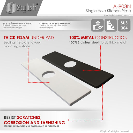 Create a seamless mounting surface for your new faucet with this deck plate. With a simple, modern design, this deck plate easily transforms a three-hole installation into a single-hole installation. Made of premium stainless steel with two finishes to choose from, brushed nickel or matte black, this plate will match with your faucet. It resists scratches, corrosion and tarnishing. It will fit and look great in your kitchen, also comes with a thick foam underpad to seal it to the sink or vanity holes.