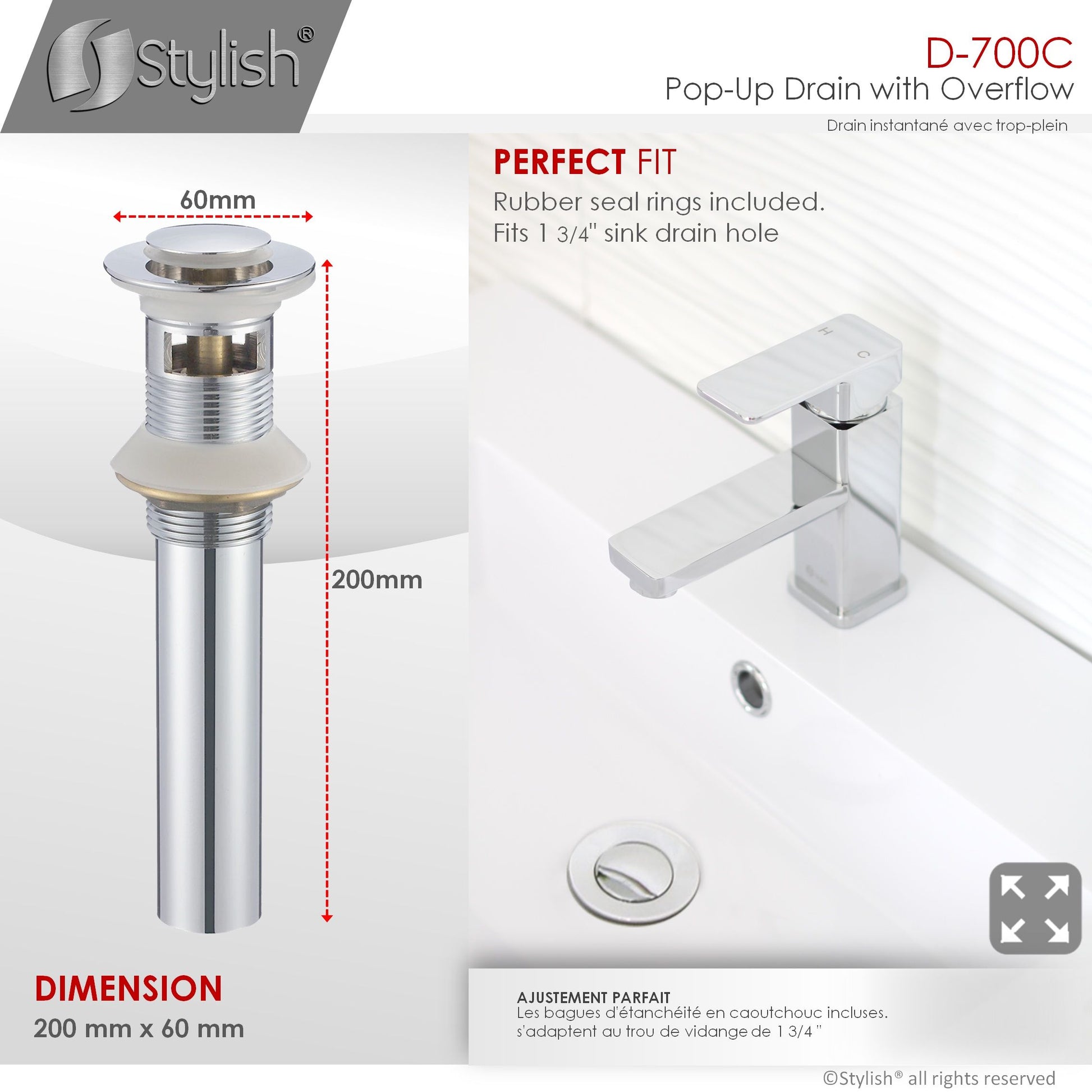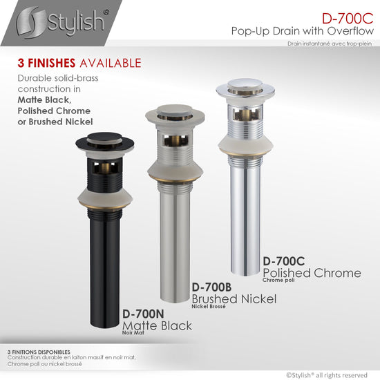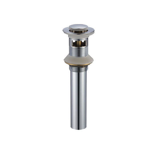 Complete the look of your bathroom with the clean lines and sturdy construction of this advanced pop-up drain with overflow. Made from durable solid-brass, this pop-up drain is designed to work with any basin, ceramic, porcelain or vessel sink. This pop-up drain readily connects to 11/4-inch plumbing hookups. Stylish pop-up drain opens and closes by pressing the top of the cap, which allows for both draining and retaining water. Choose from our three available finishes, brushed nickel, chrome or matte black, to match your décor and create a beautiful coordinated look. For easy installation, all required rubber gaskets and hardware are included, rubber seal rings fit 1-3/4-inch sink drain hole.