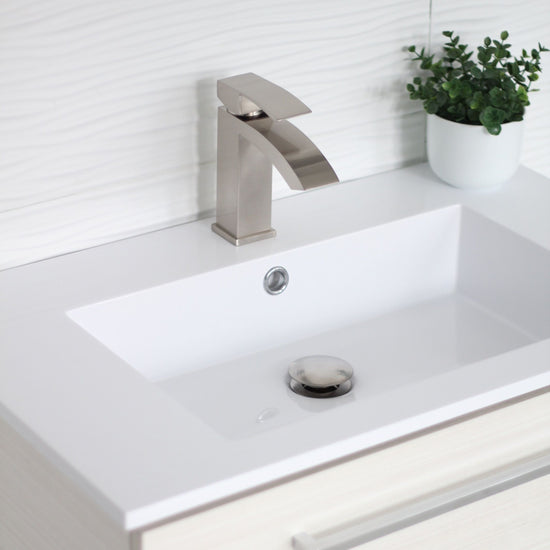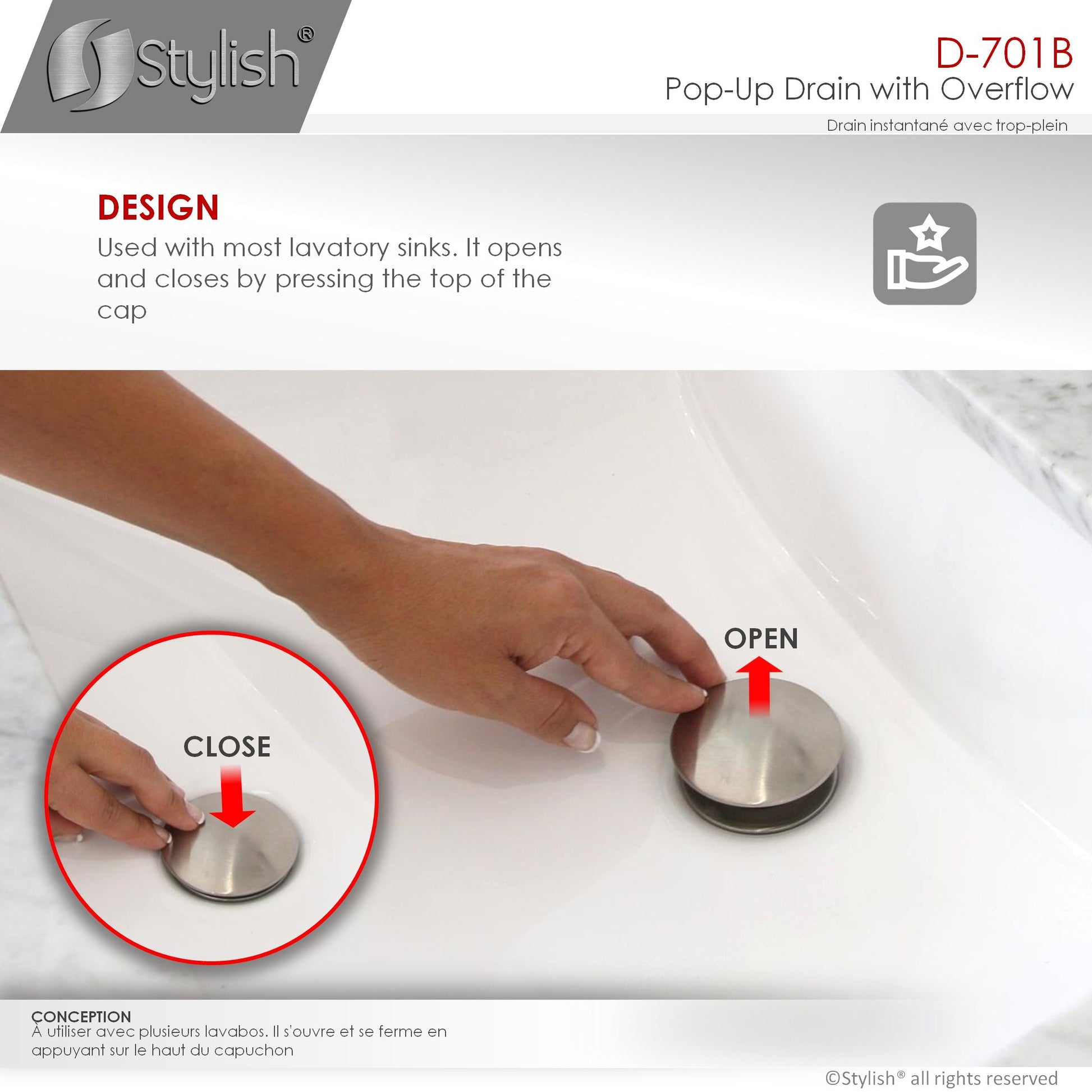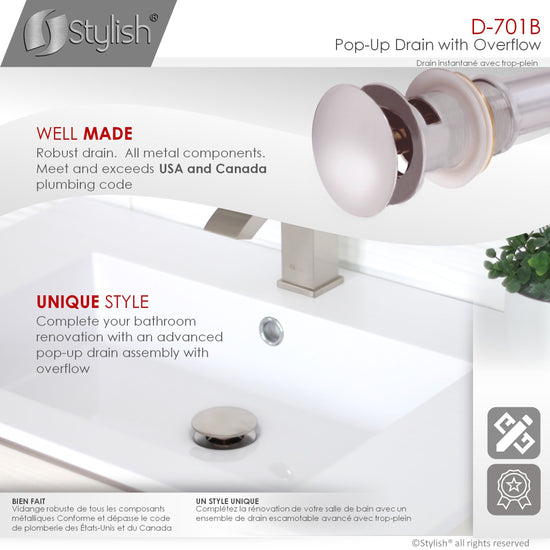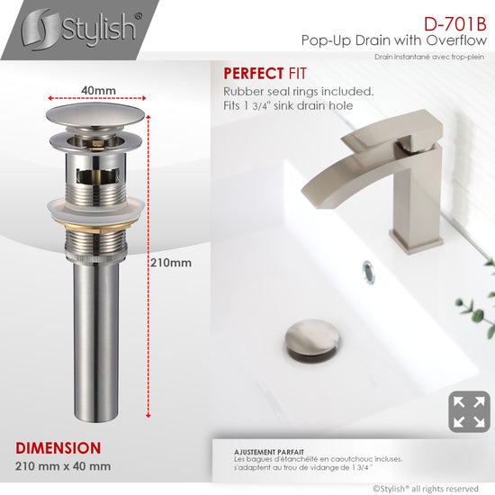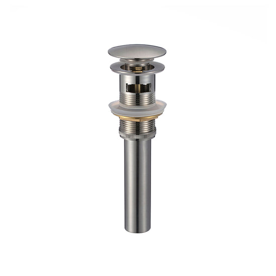 This pop-up bathroom sink drain with overflow is the perfect and essential accessory for your sink. It is fully made of solid brass for strength and durability and available in three finishes, brushed nickel, chrome and matte black. It fits any standard size basin, ceramic, porcelain or vessel sink and it's easy to install. For easy installation, all rubber gaskets and hardware are included, rubber seal rings fit 1-3/4-inch sink drain hole. This bathroom vanity sink pop-up drain readily connects to 1 1/4-inch plumbing hookups. It operates by simply pressing the drain cover to open and close, allowing to drain or retain water in the sink. Complete the look of your bathroom with this functional and stylish bathroom vanity sink pop-up drain.