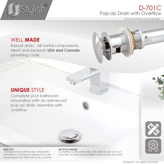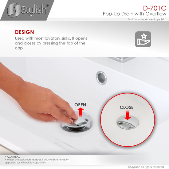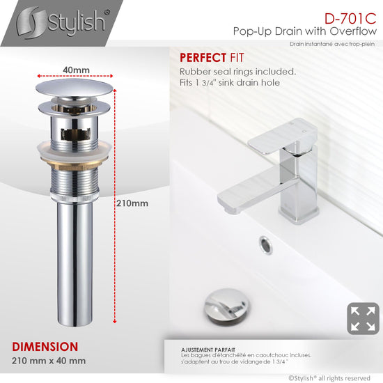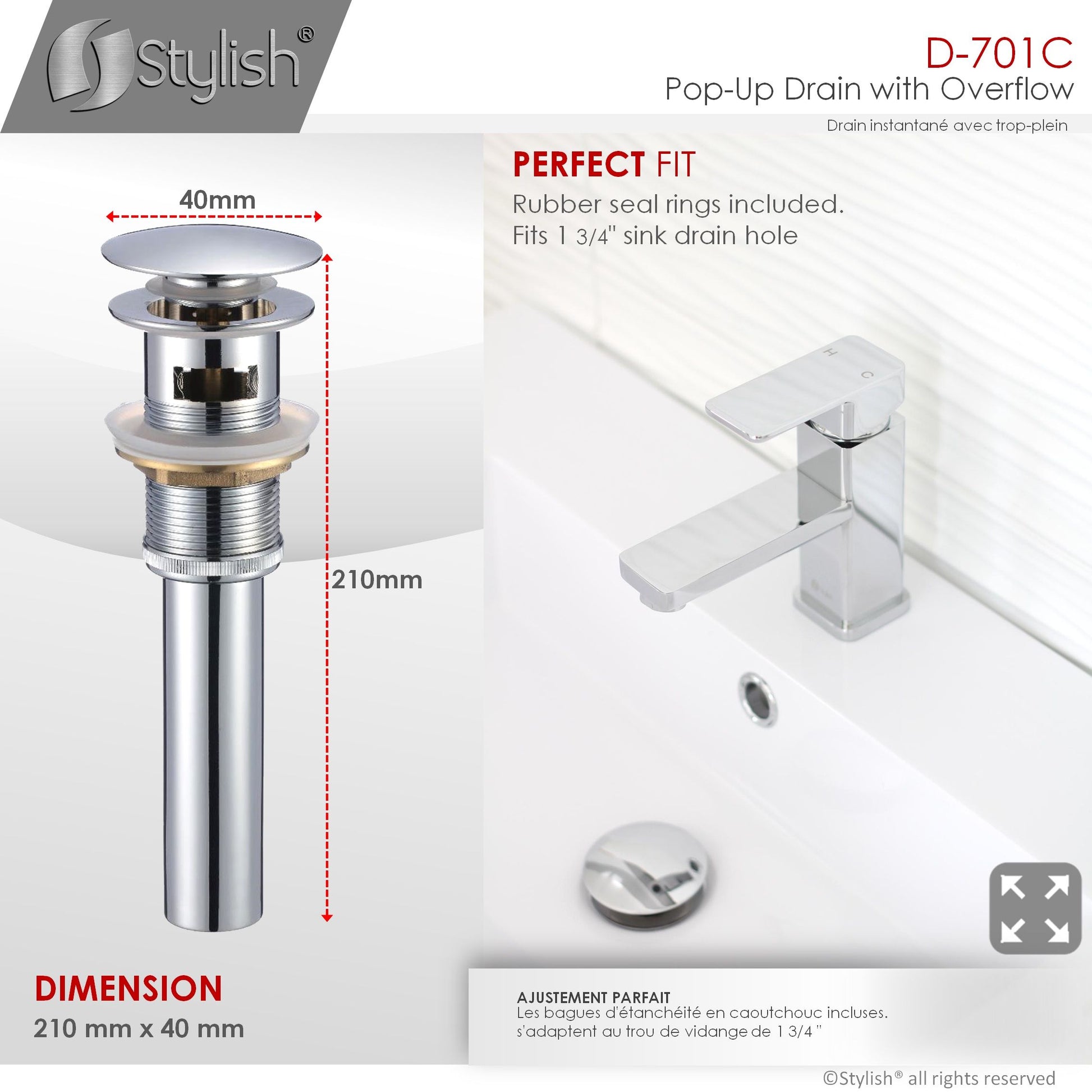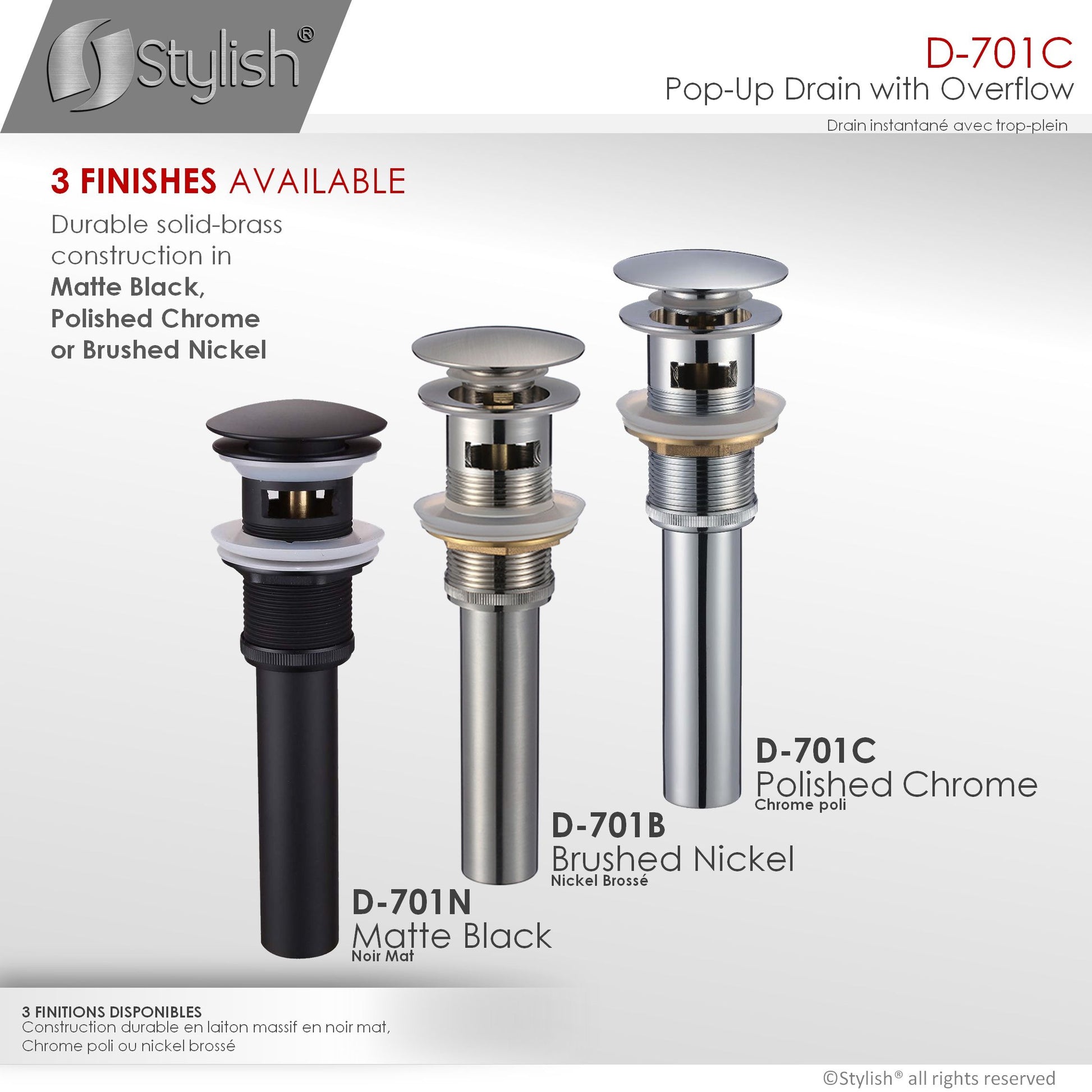 This pop-up bathroom sink drain with overflow is the perfect and essential accessory for your sink. It is fully made of solid brass for strength and durability and available in three finishes, brushed nickel, chrome and matte black. It fits any standard size basin, ceramic, porcelain or vessel sink and it's easy to install. For easy installation, all rubber gaskets and hardware are included, rubber seal rings fit 1-3/4-inch sink drain hole. This bathroom vanity sink pop-up drain readily connects to 1 1/4-inch plumbing hookups. It operates by simply pressing the drain cover to open and close, allowing to drain or retain water in the sink. Complete the look of your bathroom with this functional and stylish bathroom vanity sink pop-up drain.