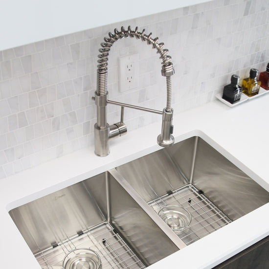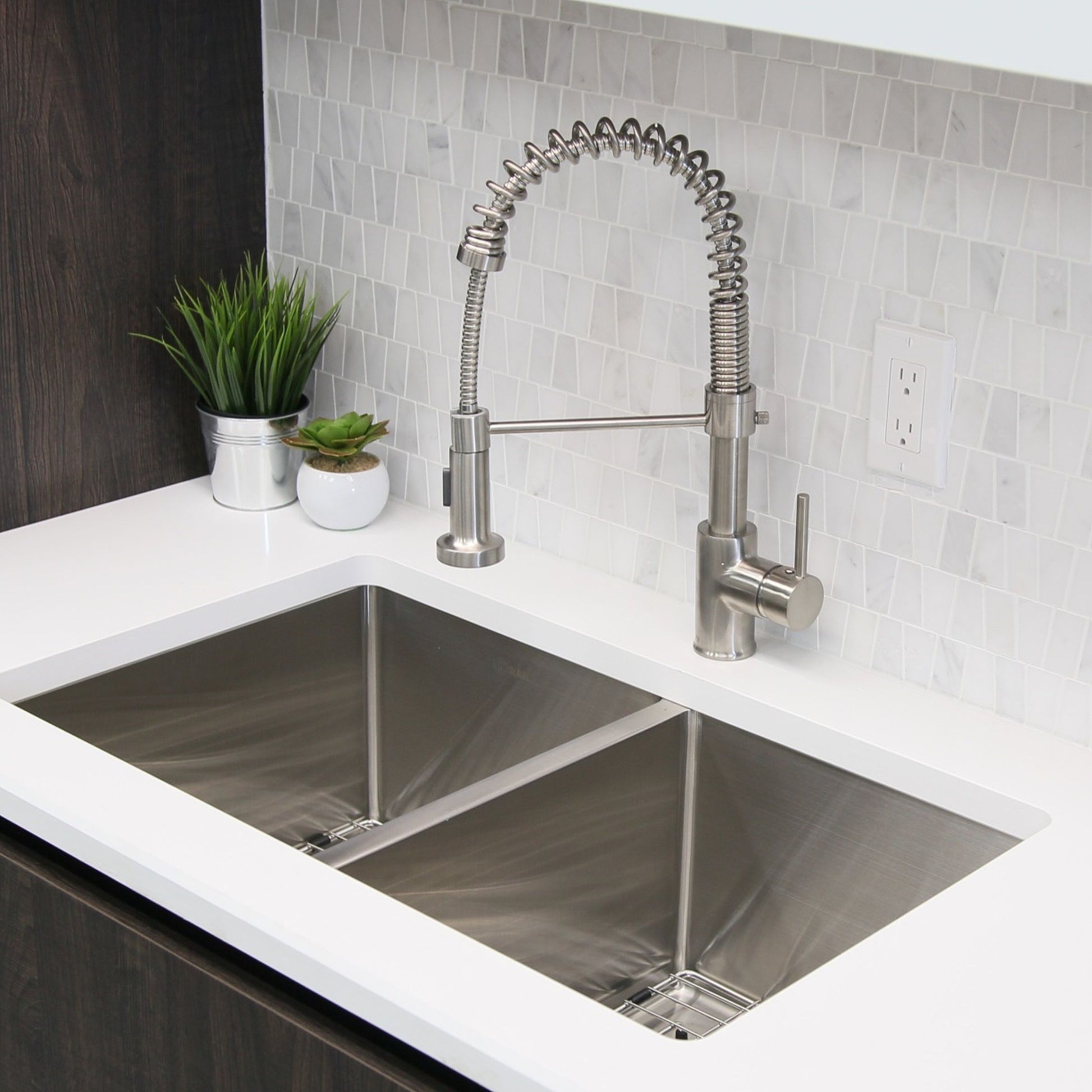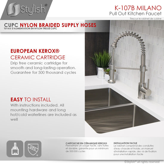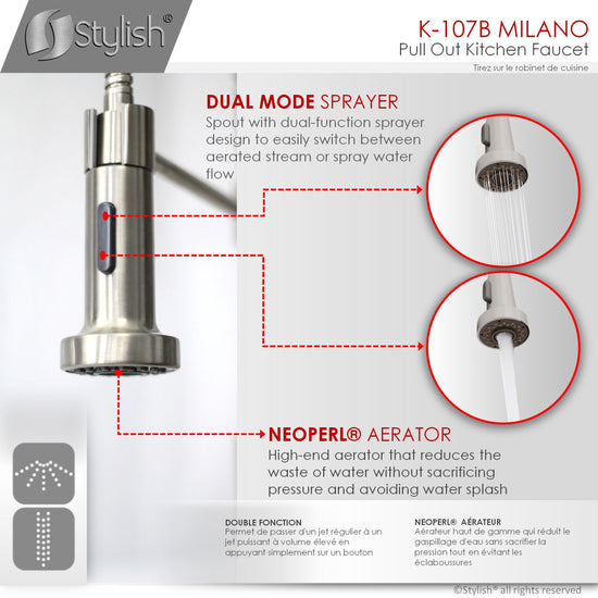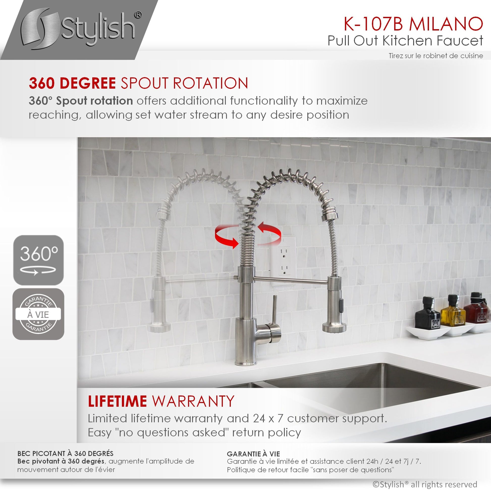 This commercial spring with pull down sprayer faucet brings a refreshed modern look to your home. Your kitchen will pop when you install this amazing faucet. The pull-down, dual action spray head on the pull down single handle kitchen faucet allows for your choice of aerated flow or powerful spray for all your modern kitchen needs. The 360° swivel spout extends up to 30", and its spiral details and solid brass construction make it a highly functional and beautiful statement piece.This kitchen faucet has been made with certified lead-free material and top-quality components ensuring lasting value and superior performance. One of the high-performance components is an ultra-durable Kerox ceramic cartridge which has been tested for over 500,000 cycles. Also, a best-in-industry Neoperl aerator that reduces the waste of water without sacrificing pressure.