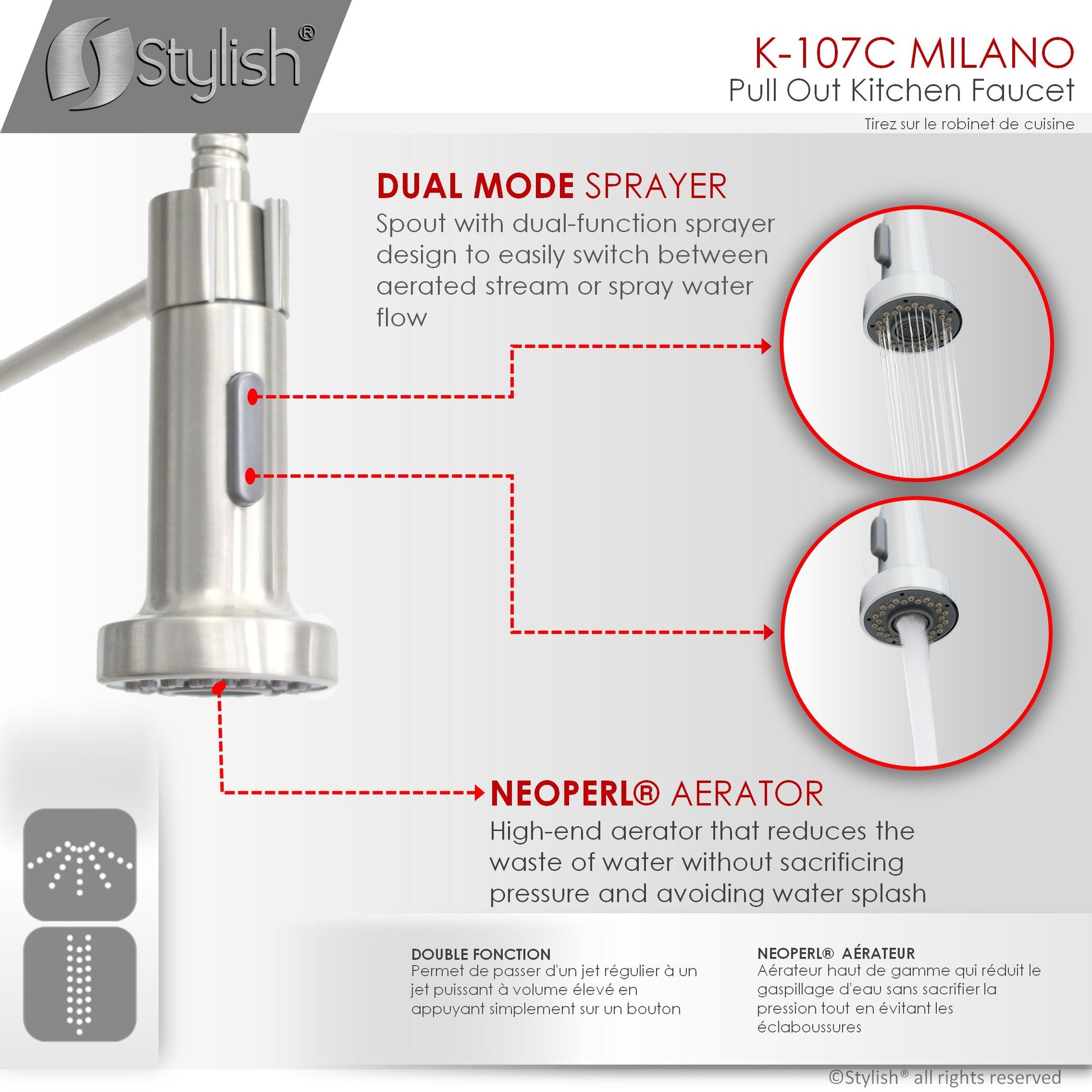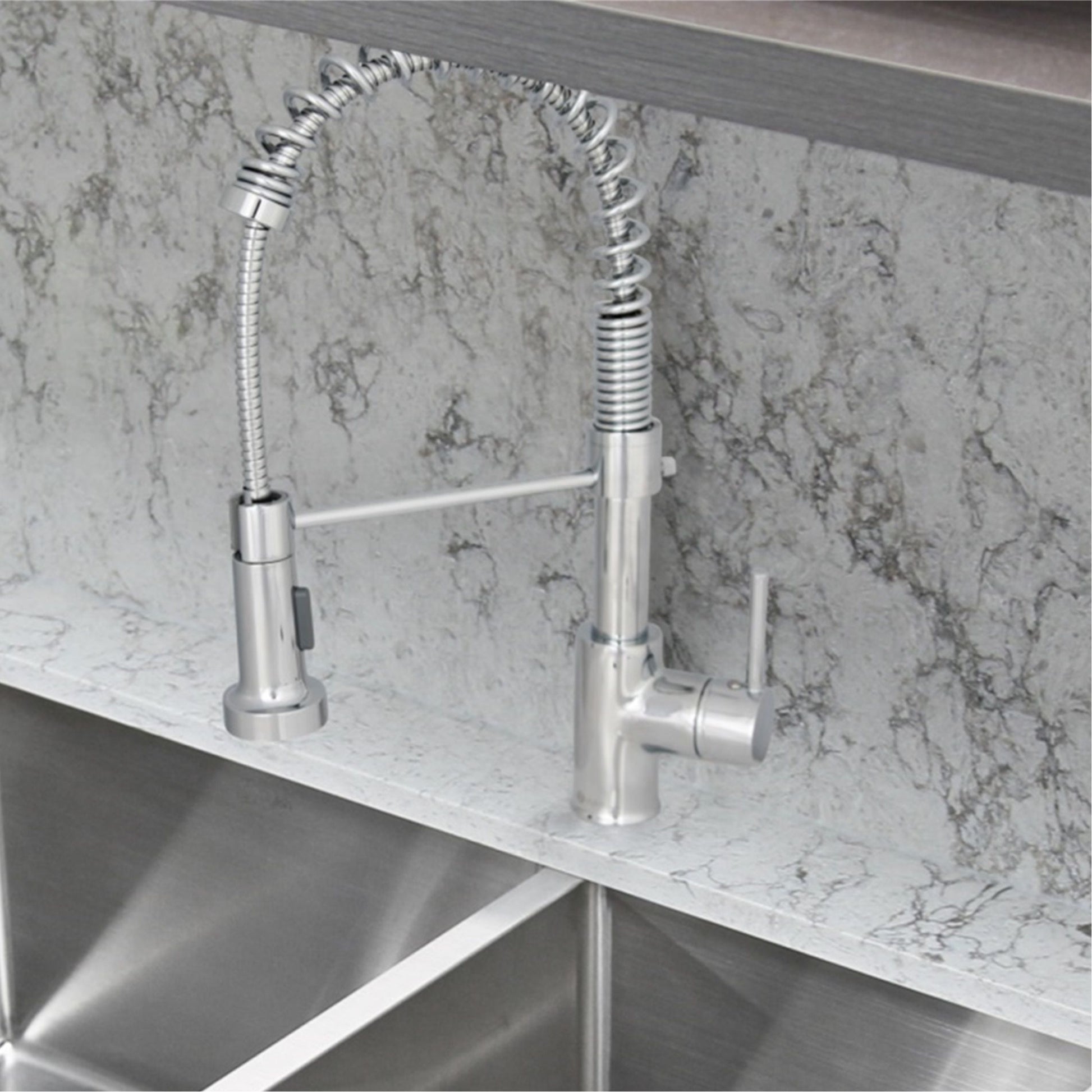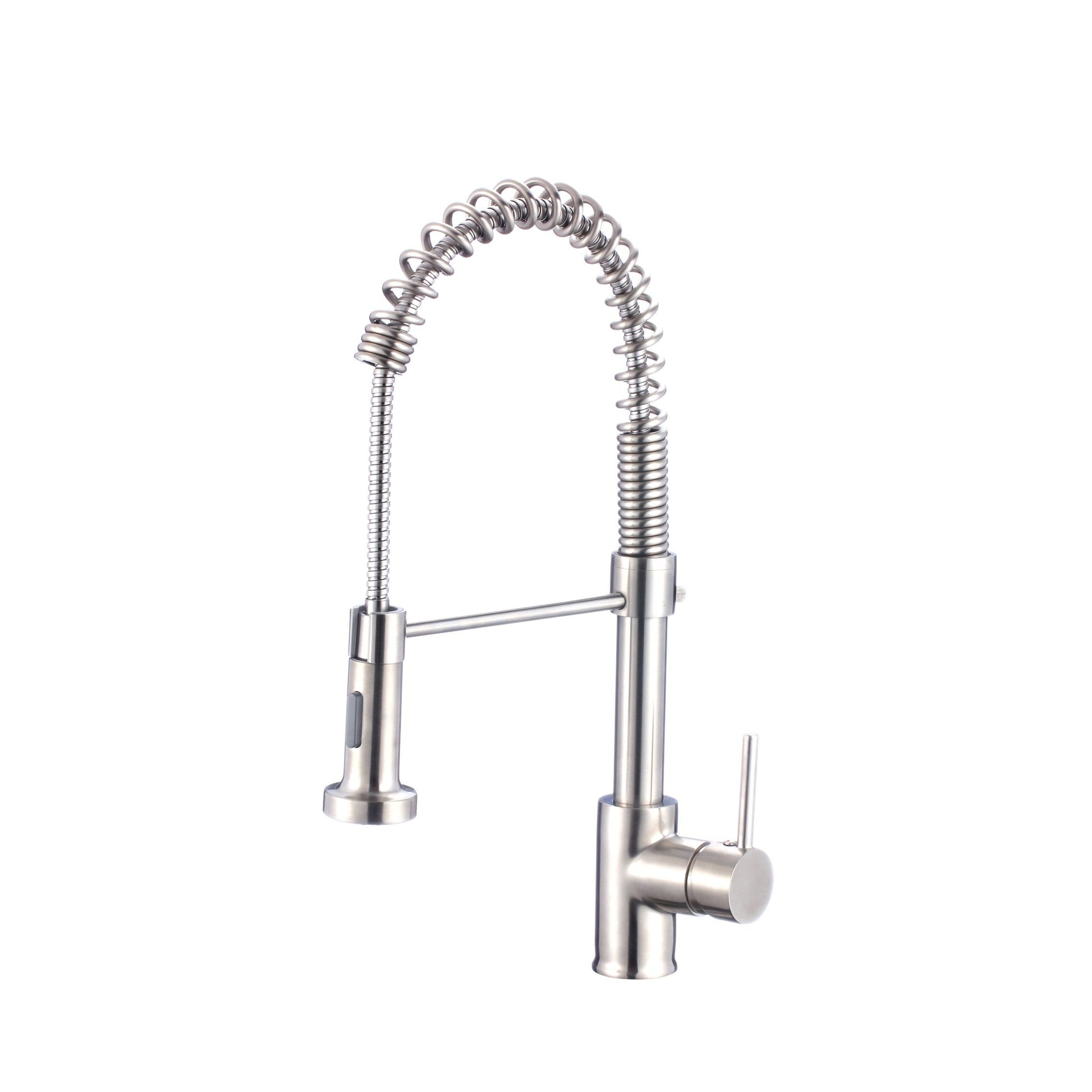 This commercial spring with pull down sprayer faucet brings a refreshed modern look to your home. Your kitchen will pop when you install this amazing faucet. The pull-down, dual action spray head on the pull down single handle kitchen faucet allows for your choice of aerated flow or powerful spray for all your modern kitchen needs. The 360° swivel spout extends up to 30", and its spiral details and solid brass construction make it a highly functional and beautiful statement piece.This kitchen faucet has been made with certified lead-free material and top-quality components ensuring lasting value and superior performance. One of the high-performance components is an ultra-durable Kerox ceramic cartridge which has been tested for over 500,000 cycles. Also, a best-in-industry Neoperl aerator that reduces the waste of water without sacrificing pressure.