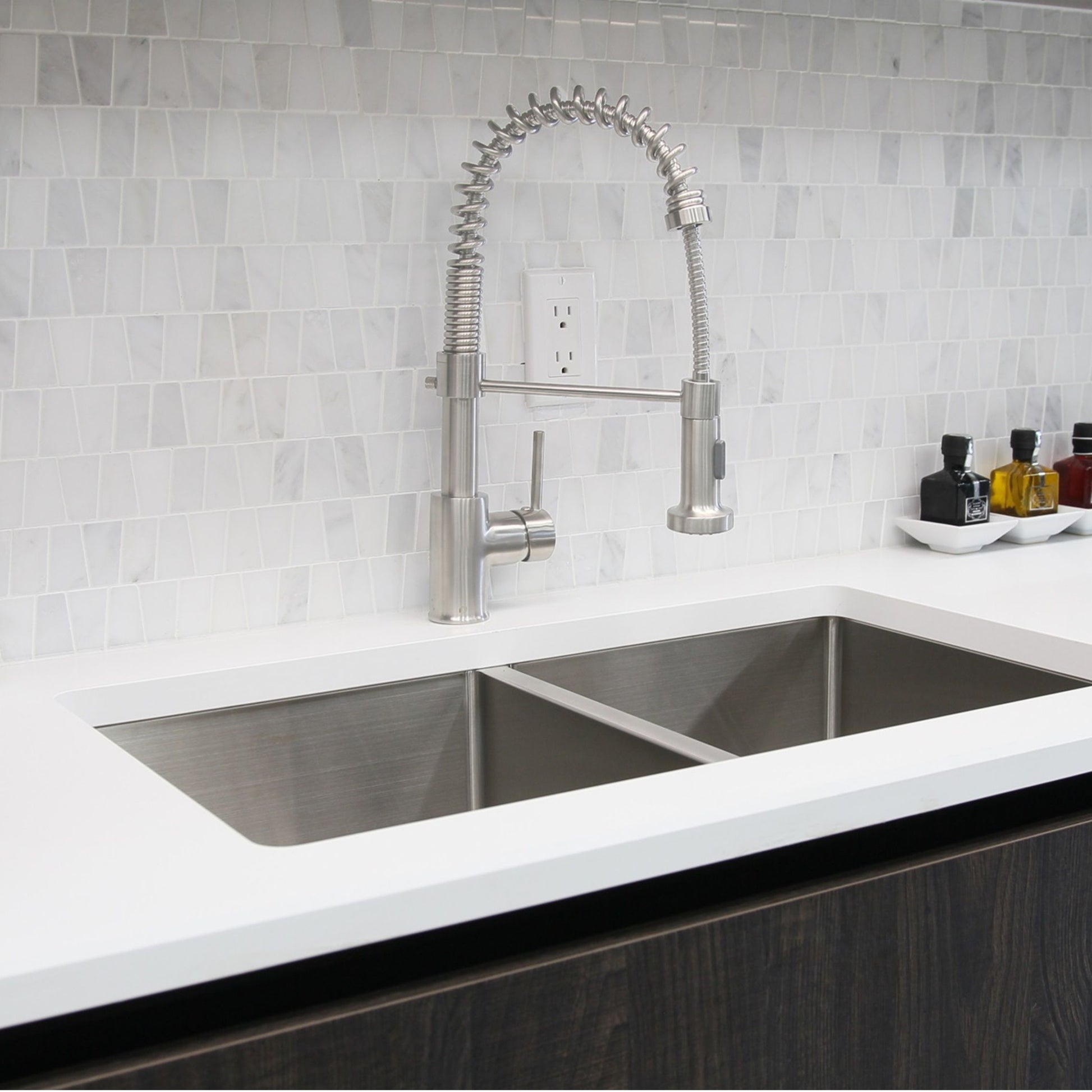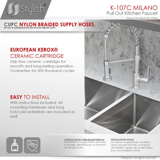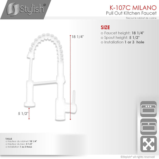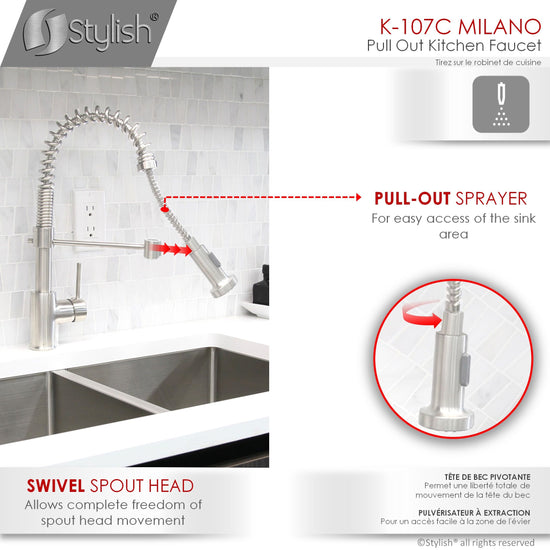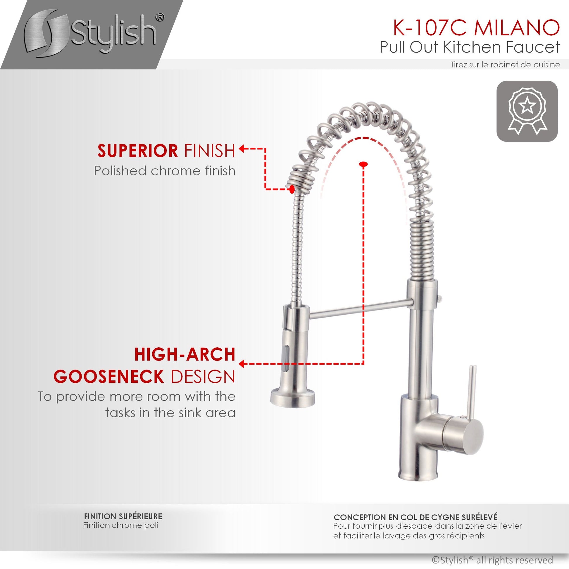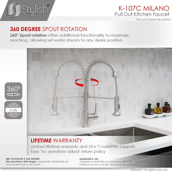 This commercial spring with pull down sprayer faucet brings a refreshed modern look to your home. Your kitchen will pop when you install this amazing faucet. The pull-down, dual action spray head on the pull down single handle kitchen faucet allows for your choice of aerated flow or powerful spray for all your modern kitchen needs. The 360° swivel spout extends up to 30", and its spiral details and solid brass construction make it a highly functional and beautiful statement piece.This kitchen faucet has been made with certified lead-free material and top-quality components ensuring lasting value and superior performance. One of the high-performance components is an ultra-durable Kerox ceramic cartridge which has been tested for over 500,000 cycles. Also, a best-in-industry Neoperl aerator that reduces the waste of water without sacrificing pressure.