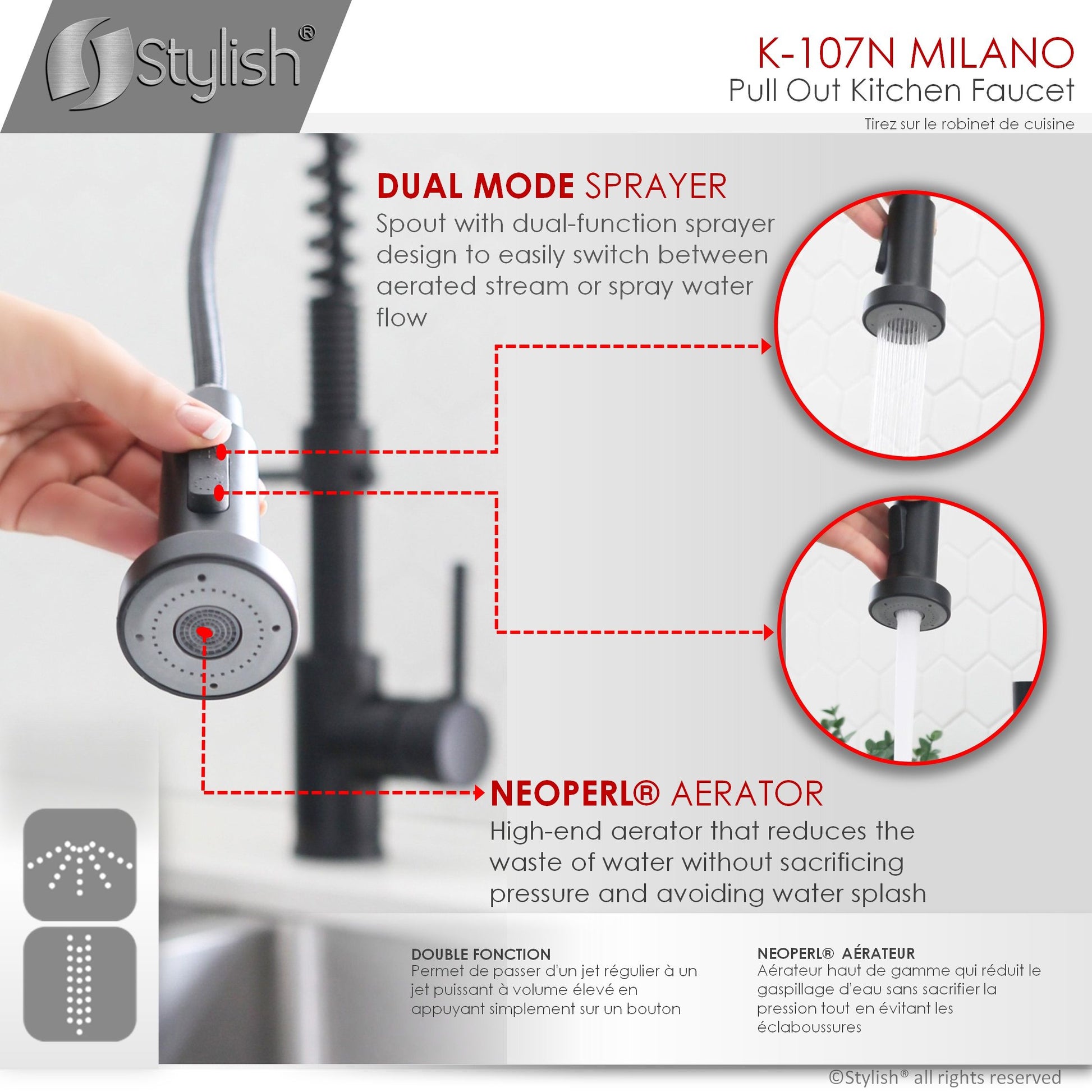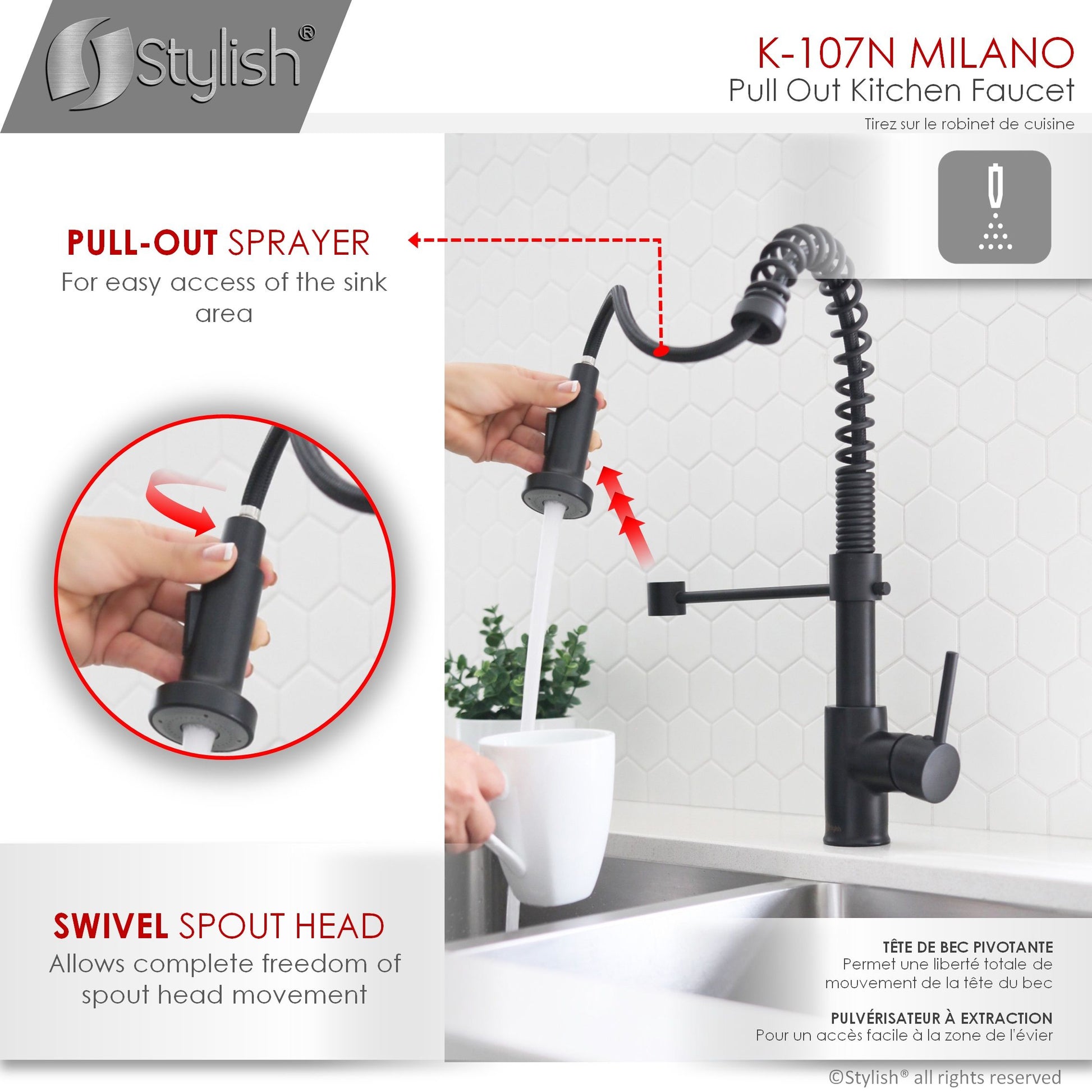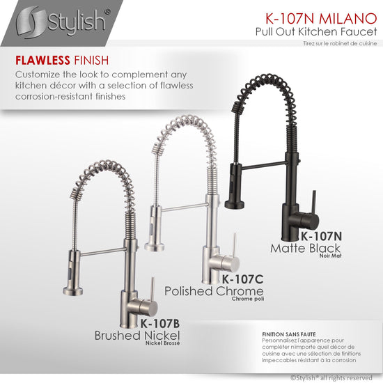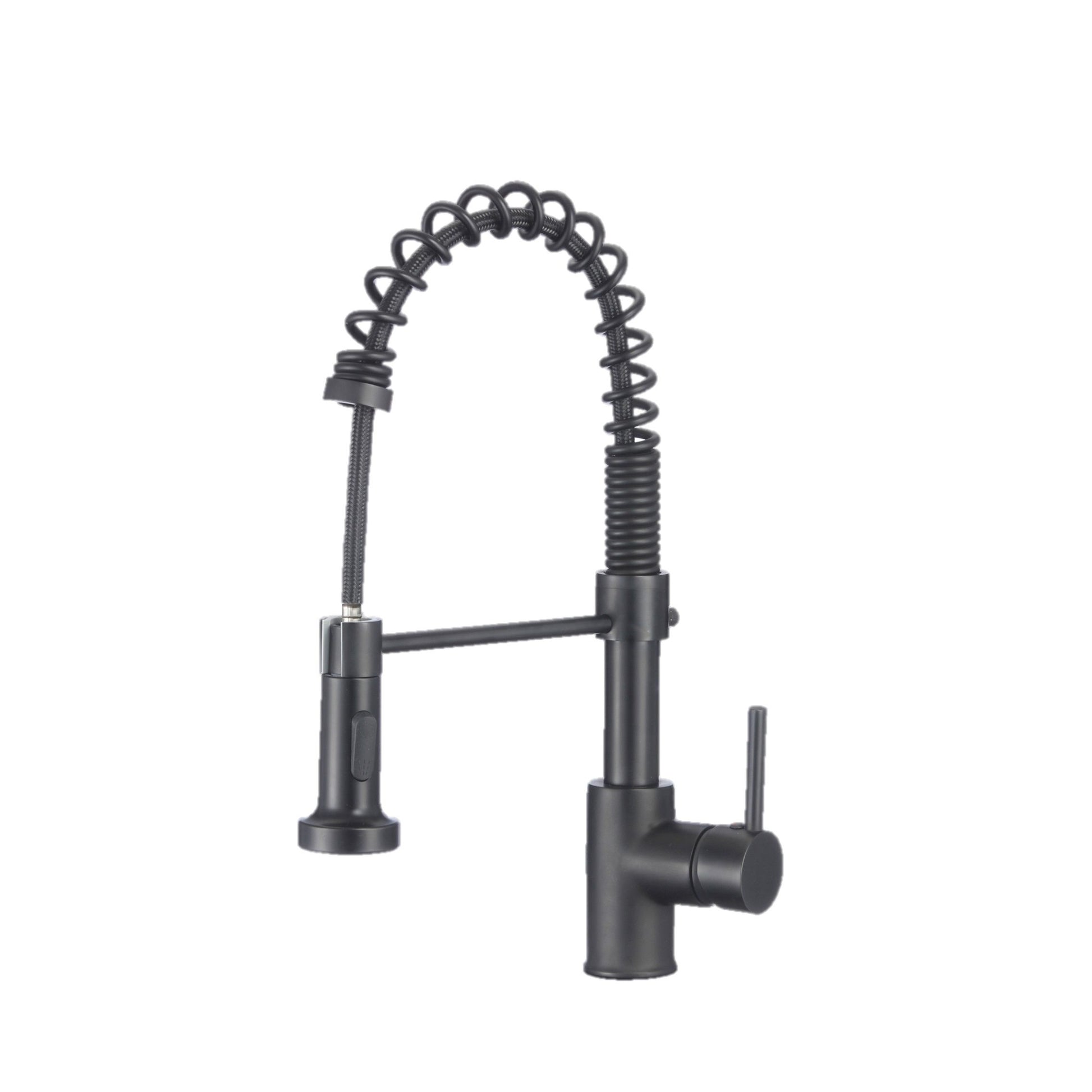 This commercial spring with pull down sprayer faucet brings a refreshed modern look to your home. Your kitchen will pop when you install this amazing faucet. The pull-down, dual action spray head on the pull down single handle kitchen faucet allows for your choice of aerated flow or powerful spray for all your modern kitchen needs. The 360° swivel spout extends up to 30", and its spiral details and solid brass construction make it a highly functional and beautiful statement piece.This kitchen faucet has been made with certified lead-free material and top-quality components ensuring lasting value and superior performance. One of the high-performance components is an ultra-durable Kerox ceramic cartridge which has been tested for over 500,000 cycles. Also, a best-in-industry Neoperl aerator that reduces the waste of water without sacrificing pressure.