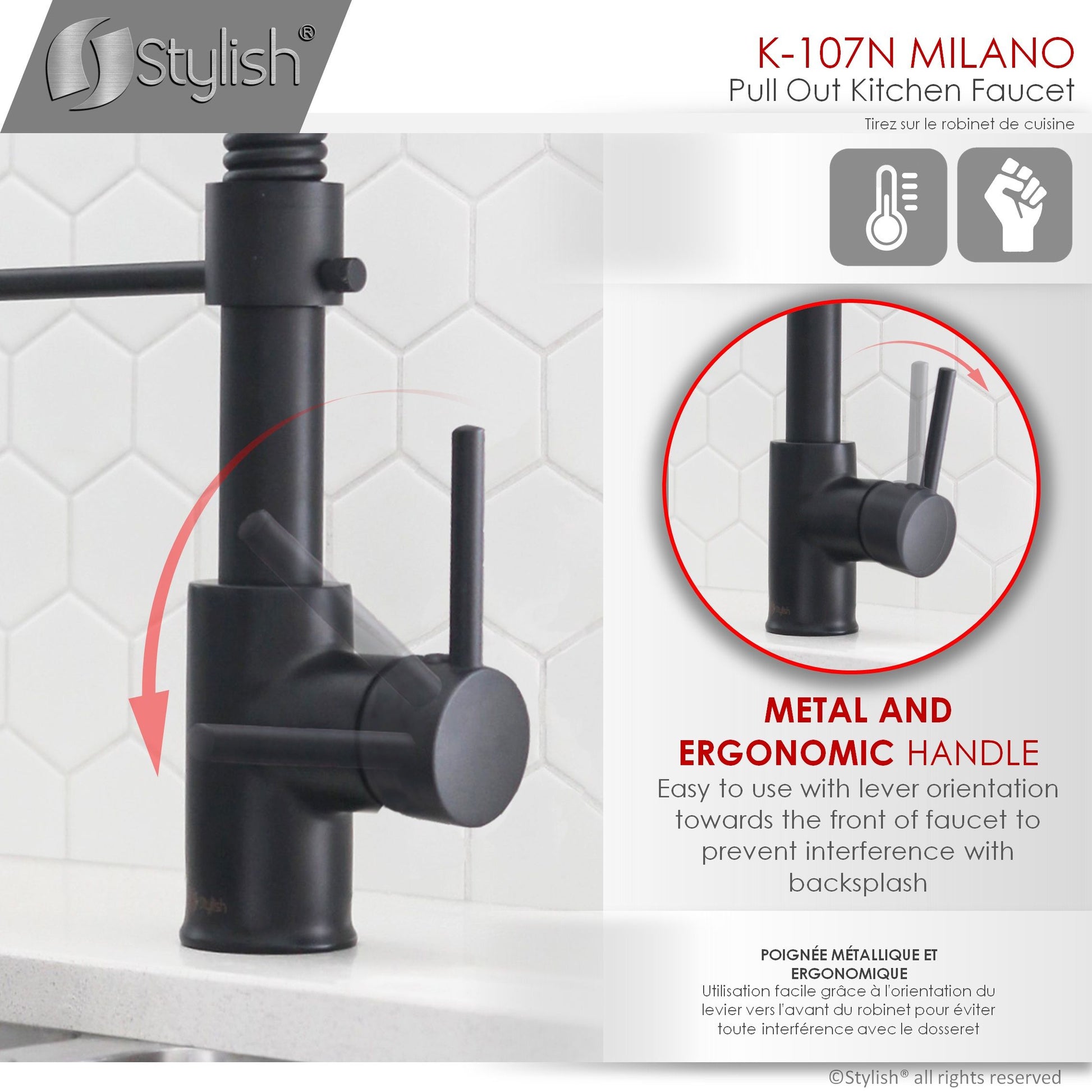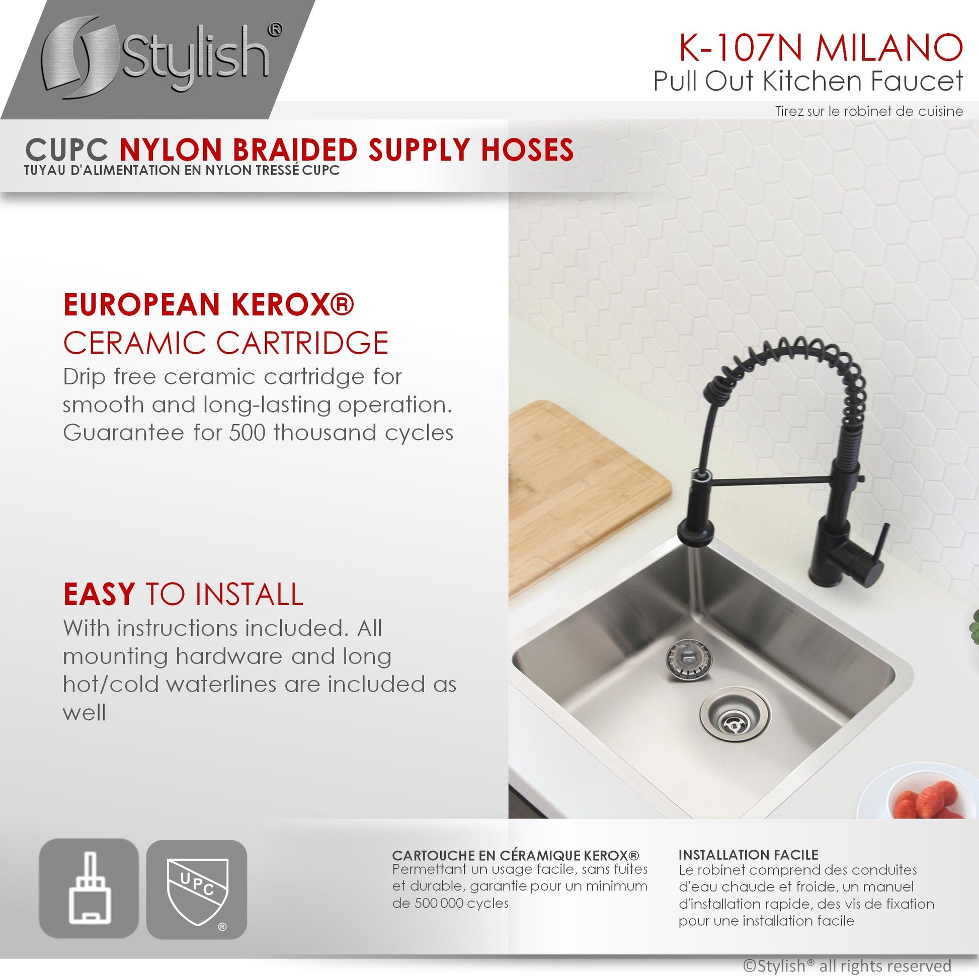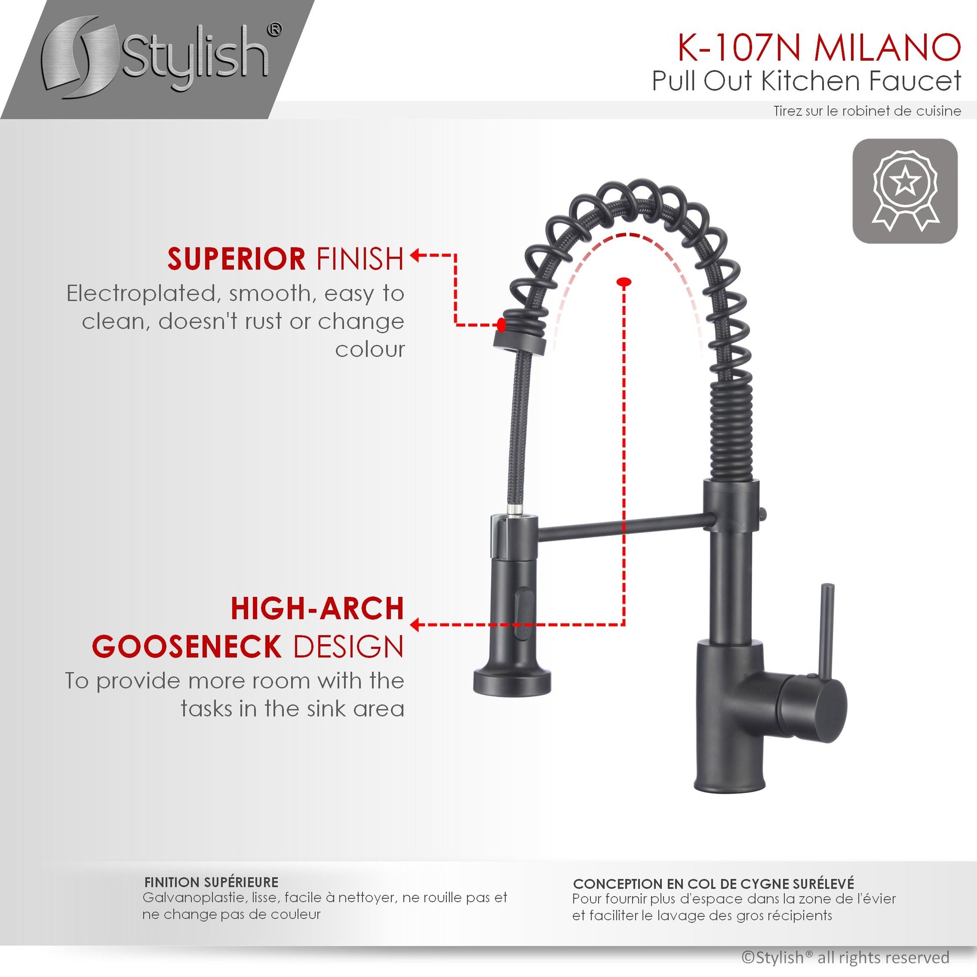 This commercial spring with pull down sprayer faucet brings a refreshed modern look to your home. Your kitchen will pop when you install this amazing faucet. The pull-down, dual action spray head on the pull down single handle kitchen faucet allows for your choice of aerated flow or powerful spray for all your modern kitchen needs. The 360° swivel spout extends up to 30", and its spiral details and solid brass construction make it a highly functional and beautiful statement piece.This kitchen faucet has been made with certified lead-free material and top-quality components ensuring lasting value and superior performance. One of the high-performance components is an ultra-durable Kerox ceramic cartridge which has been tested for over 500,000 cycles. Also, a best-in-industry Neoperl aerator that reduces the waste of water without sacrificing pressure.