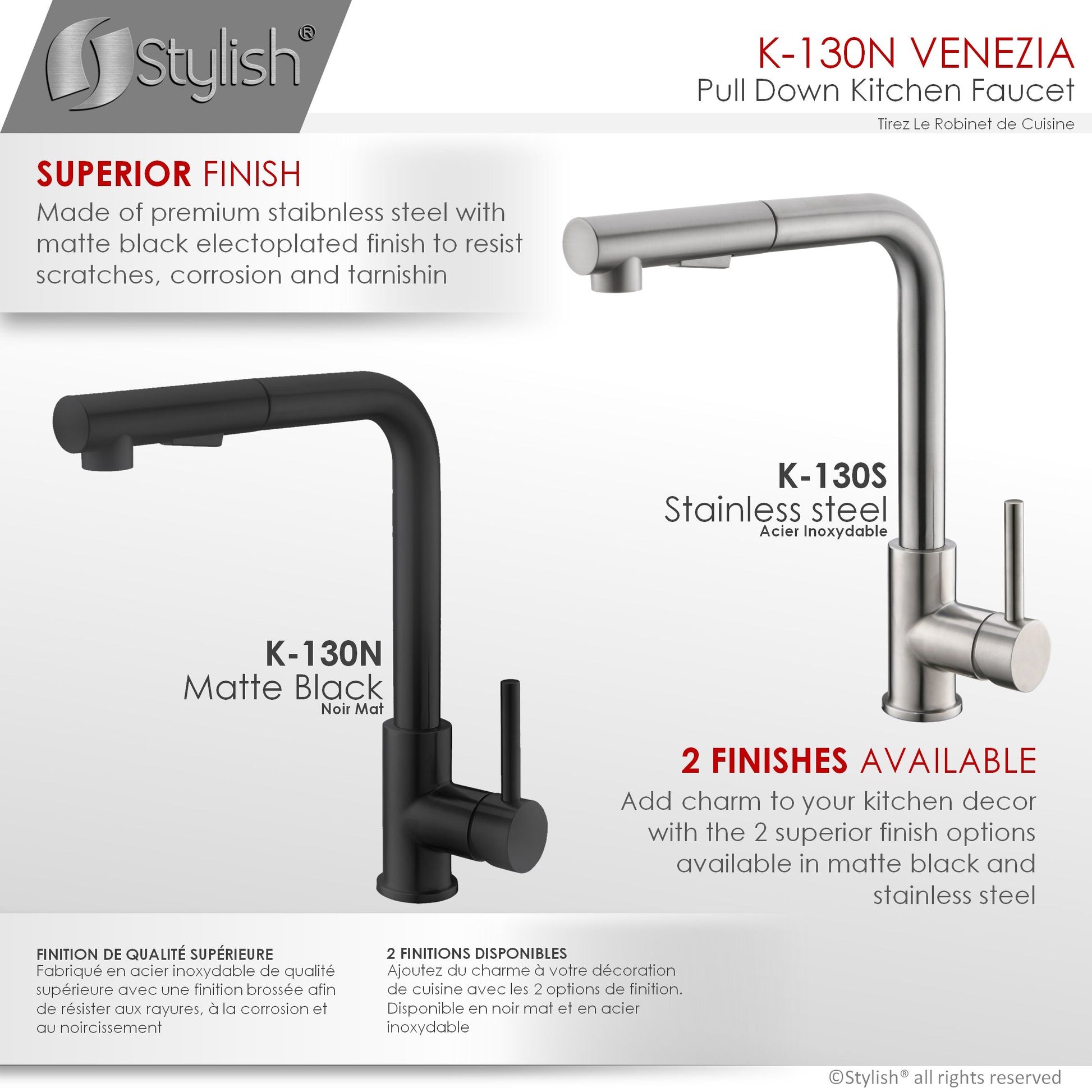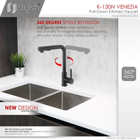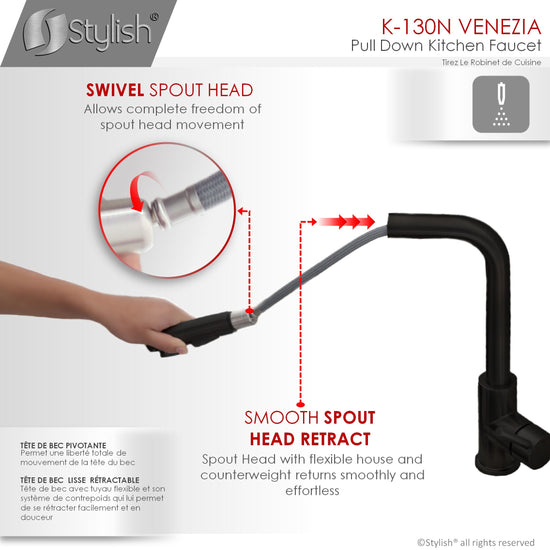 K130 This elegant Single Handle Pull Down Kitchen Sink Faucet has a clean, bold design that suits any modern or contemporary kitchen décor. The dual-function sprayer has been designed to easily switch between aerated stream and spray water flow. The pull-out sprayerprovides maximum reach for flexible functionality. The handle moves 90 degrees forward to allow ample range of motion and to avoid hitting he backsplash. This faucet has been manufactured with top-quality components to ensure superior performance and durability. The Ceramtec ceramic cartridge ensures lasting drip-free use the Neoperl aerator reduces water waste without sacrificing pressure. The soft rubber nozzles in the spray head will prevent hard water and lime scale build-up, making maintenance easy.