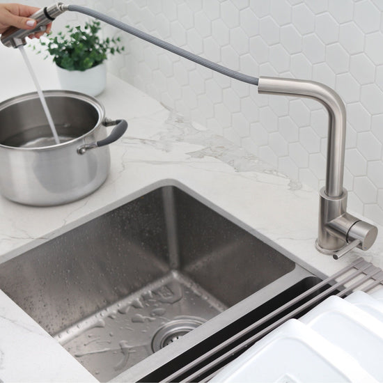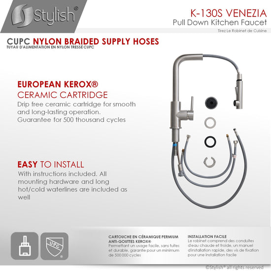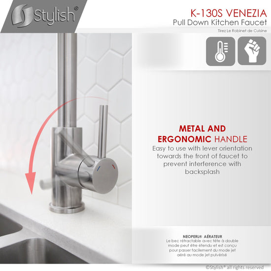 K130 This elegant Single Handle Pull Down Kitchen Sink Faucet has a clean, bold design that suits any modern or contemporary kitchen décor. The dual-function sprayer has been designed to easily switch between aerated stream and spray water flow. The pull-out sprayerprovides maximum reach for flexible functionality. The handle moves 90 degrees forward to allow ample range of motion and to avoid hitting he backsplash. This faucet has been manufactured with top-quality components to ensure superior performance and durability. The Ceramtec ceramic cartridge ensures lasting drip-free use the Neoperl aerator reduces water waste without sacrificing pressure. The soft rubber nozzles in the spray head will prevent hard water and lime scale build-up, making maintenance easy.