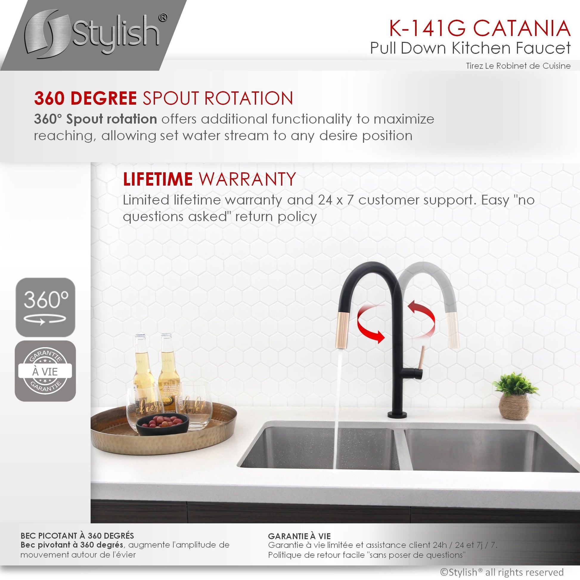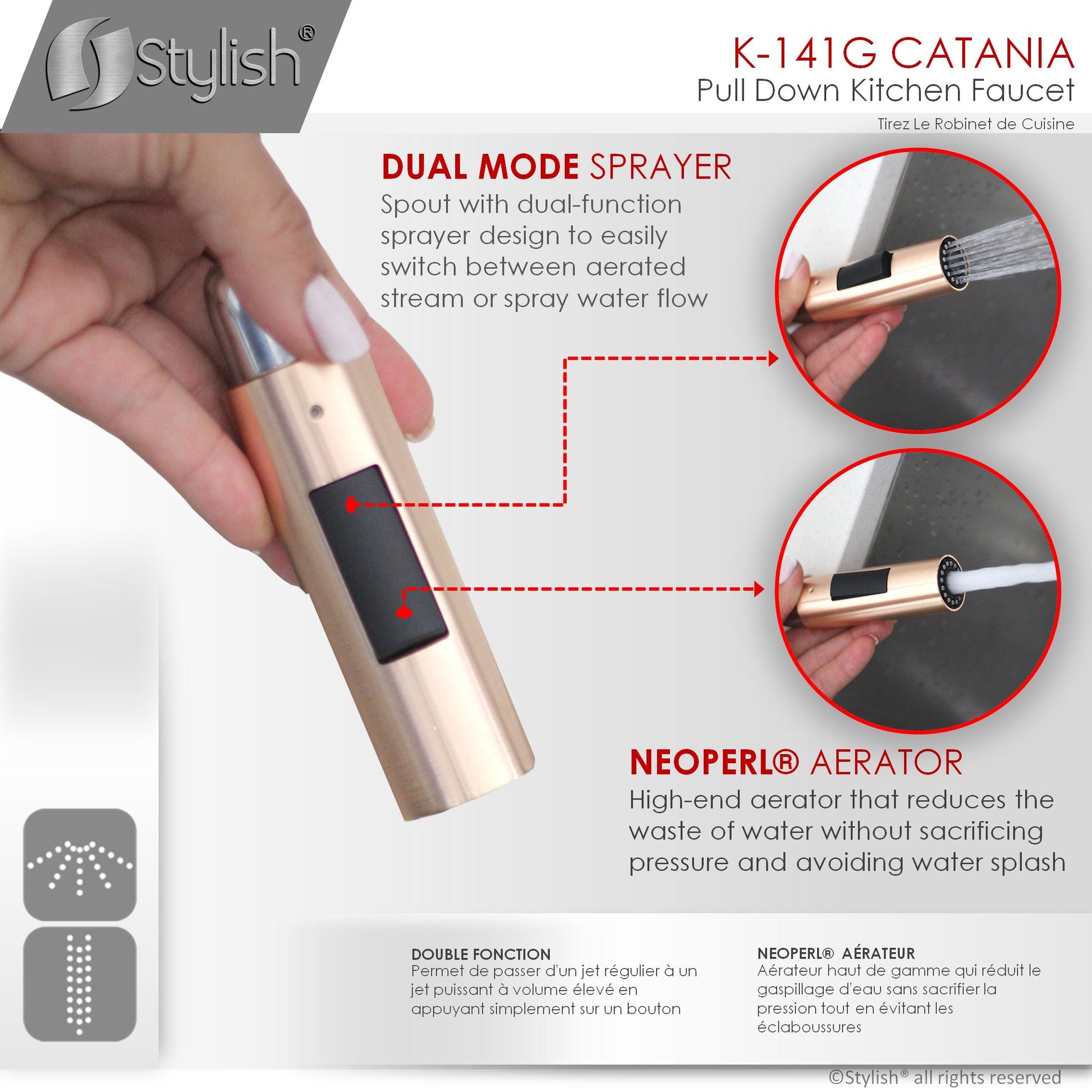 With its sharp, minimalist and contemporary design, this pull down kitchen faucet acts as a statement piece to your modern kitchen. The swivel spout head with dual adjustable water flow functionality is prepared to take on a range of uses, from cleaning, cooking or washing purposes. A single button allows you to instantly switch between aerated stream and spray. The pull down sprayer add even more convenience to this kitchen faucet, facilitating the access of the sink area. A 360 swivel spout is engineered with sustainable technology using an anti-drip guard mechanism to conserve water, eliminating the possibility of dripping or leakage. The kitchen faucet is also equipped with an ergonomic, single handle lever for optimal water and temperature control. This pull down kitchen faucet has been made with certified lead-free material and top-quality components ensuring superior performance and a faucet that will last a life time.