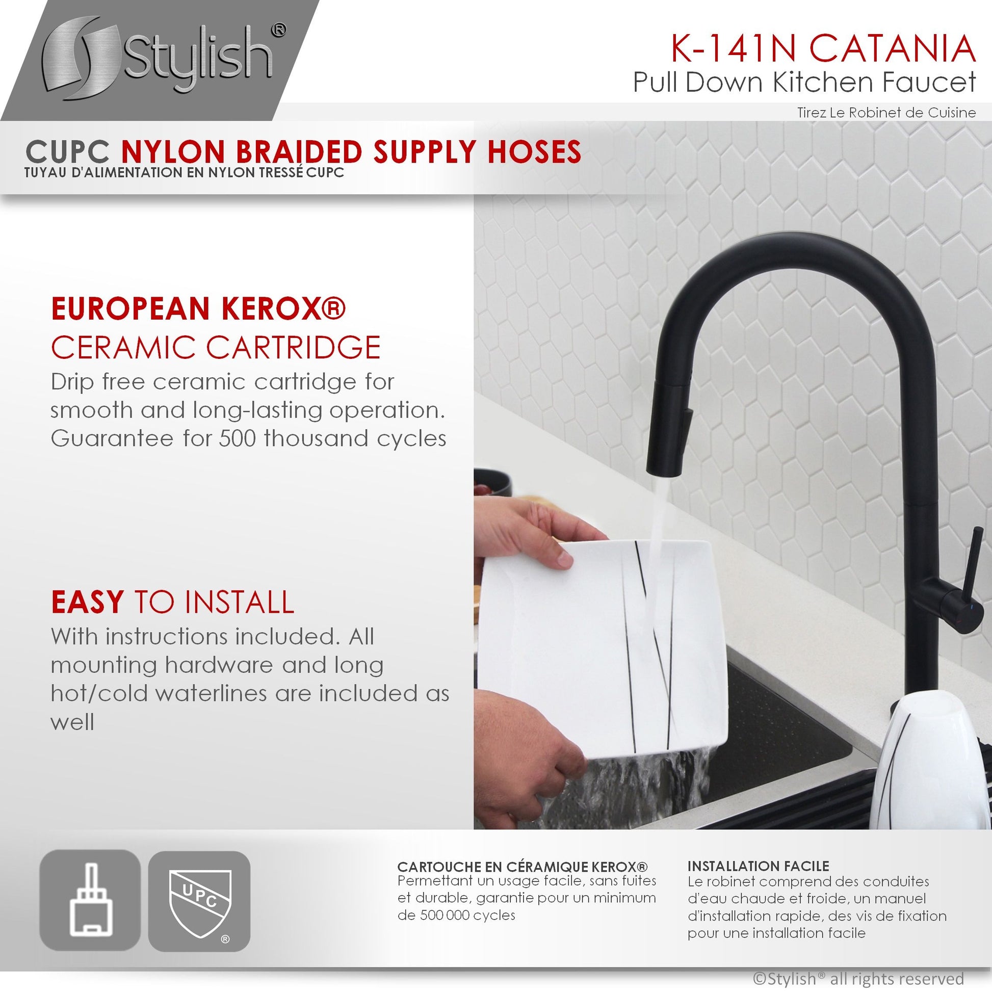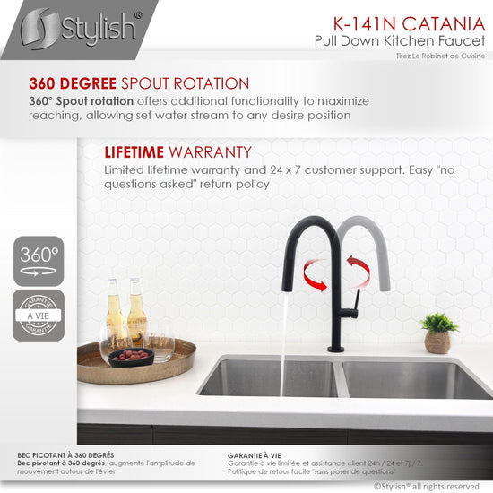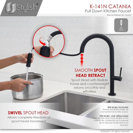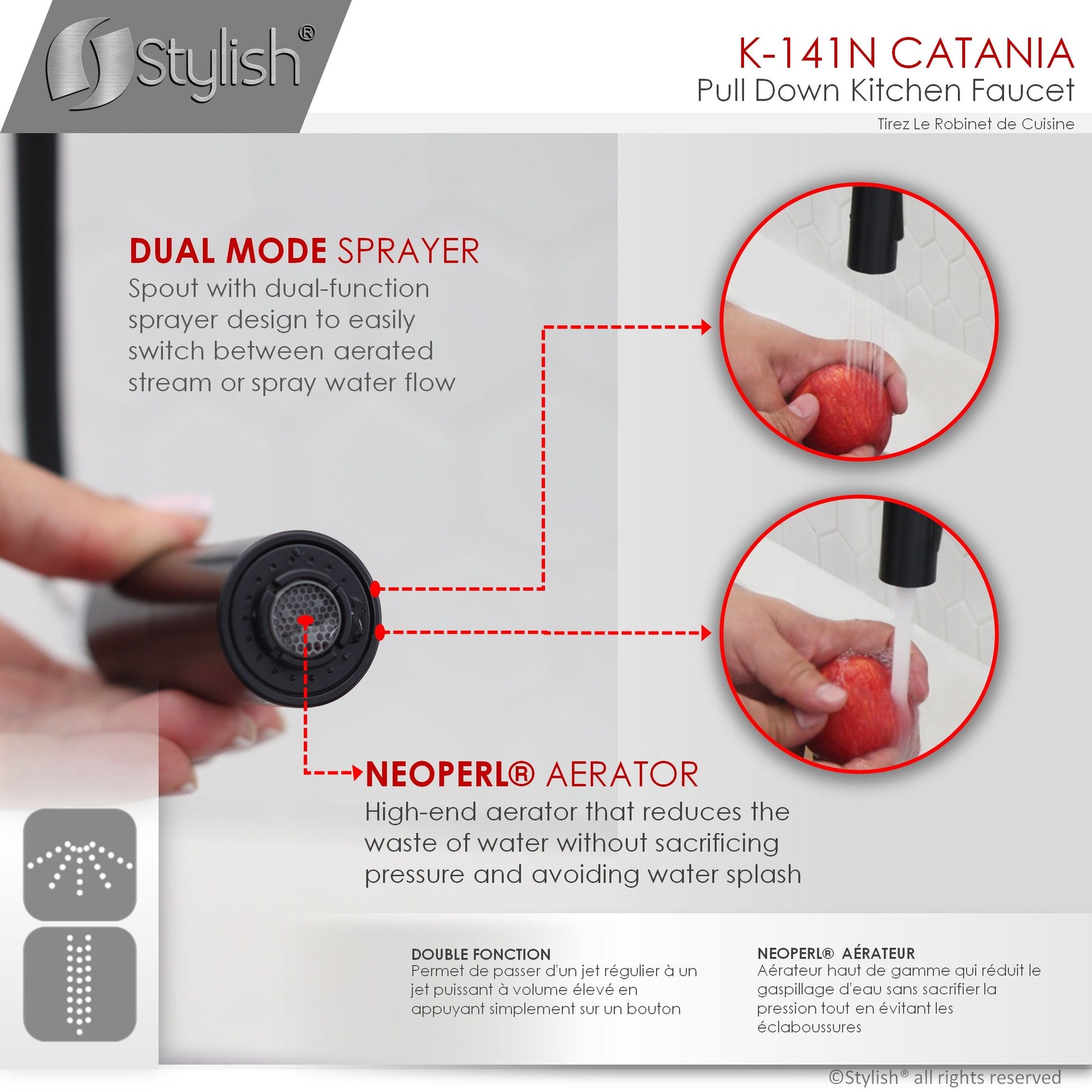 With its sharp, minimalist and contemporary design, this pull down kitchen faucet acts as a statement piece to your modern kitchen. The swivel spout head with dual adjustable water flow functionality is prepared to take on a range of uses, from cleaning, cooking or washing purposes. A single button allows you to instantly switch between aerated stream and spray. The pull down sprayer add even more convenience to this kitchen faucet, facilitating the access of the sink area. A 360 swivel spout is engineered with sustainable technology using an anti-drip guard mechanism to conserve water, eliminating the possibility of dripping or leakage. The kitchen faucet is also equipped with an ergonomic, single handle lever for optimal water and temperature control. This pull down kitchen faucet has been made with certified lead-free material and top-quality components ensuring superior performance and a faucet that will last a life time.