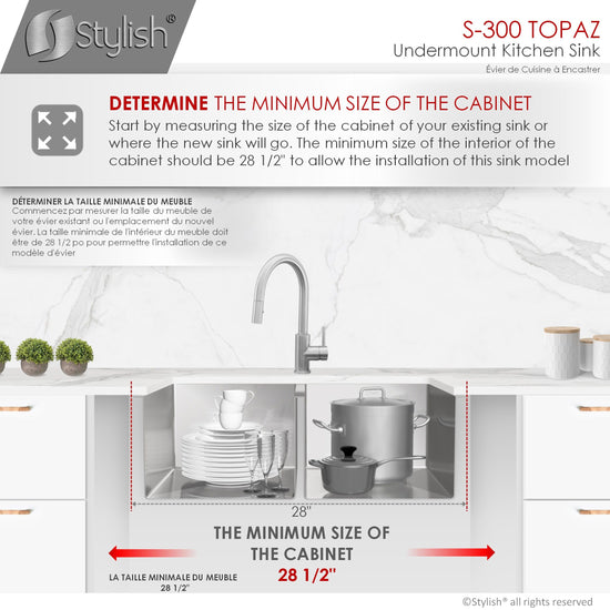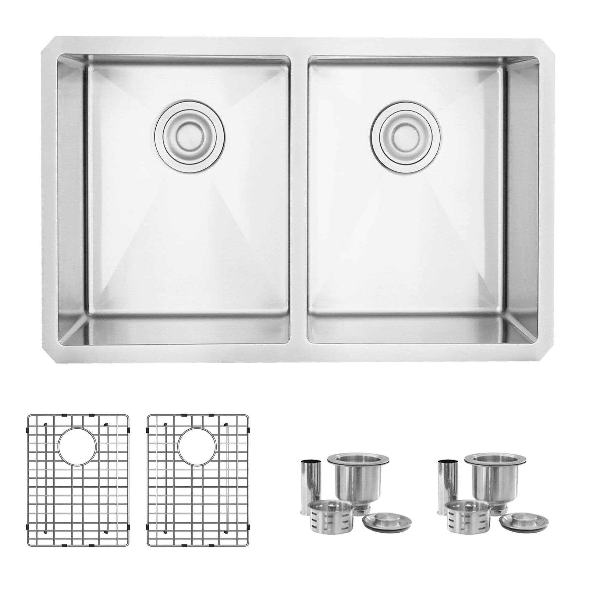 Experience luxury with STYLISH Precision Handmade 18G 18/10 Stainless Steel Double Bowl Kitchen, Sink, trusted by architects and builders for upscale projects and modern makeovers. This modern style double bowl undermount stainless steel kitchen sink integrates perfectly in a variety of kitchen spaces. Specifically designed for the busy parent and young professional in mind. From our Styluxe series, this Canadian engineered undermount double bowl stainless steel sink offers a modern, linear style with rectangular bowls. It has been made using premium 304 stainless steel with 18 gauge and 18/10 chrome-nickel content. The 18% of chrome content provides durability, maximum protection against rust and a beautiful satin finish. The 10% of nickel content provides excellent strength and hardness. It also features a refined brushed finished. Included with the sink are two matching luxury basket strainers, cutting template, mounting brackets and two perfect fit bottom grids.