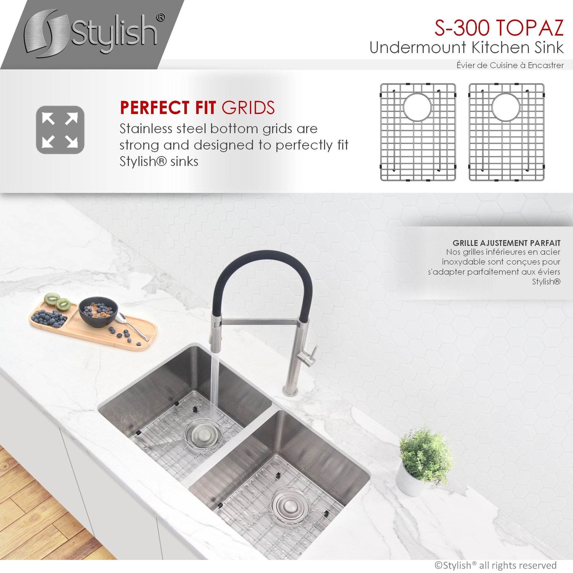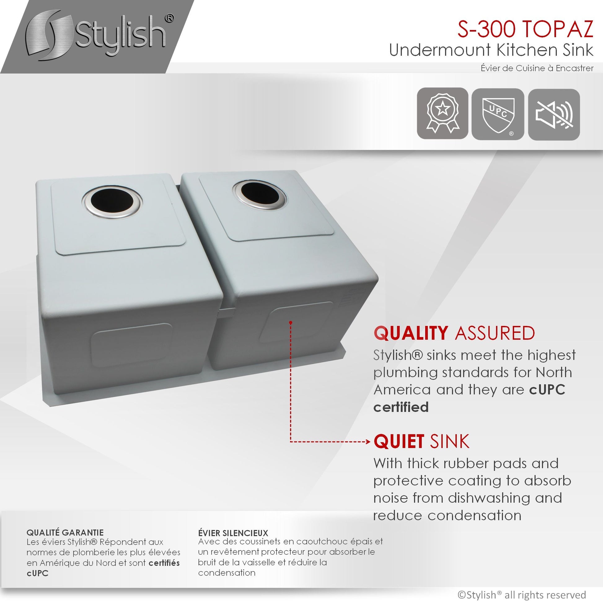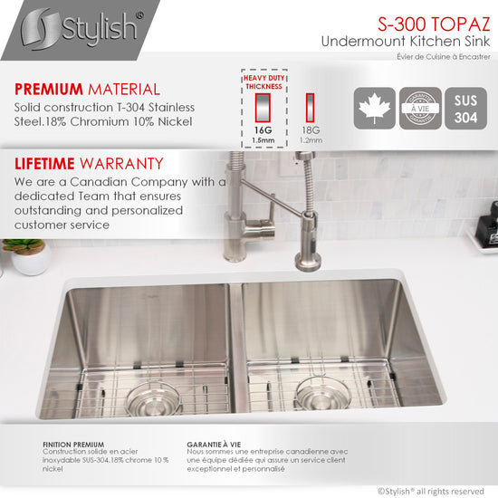 S-300XG 28inchx 18inch Undermount Double Bowl Kitchen Sink with Grids and Strainers. Experience luxury with STYLISH Precision Handmade 16G 18/10 Stainless Steel Double Bowl Kitchen, Sink, trusted by architects and builders for upscale projects & modern makeovers. This modern style double bowl undermount stainless steel kitchen sink integrates perfectly in a variety of kitchen spaces. Specifically designed for the busy parent and young professional in mind. From our Styluxe series, this Canadian engineered undermount double bowl stainless steel sink offers a modern, linear style with rectangular bowls. It has been made using premium 304 stainless steel with super thick 16 gauge and 18/10 chrome-nickel content. The 18% of chrome content provides durability, maximum protection against rust and a beautiful satin finish. The 10% of nickel content provides excellent strength and hardness. It also features a refined brushed finished.