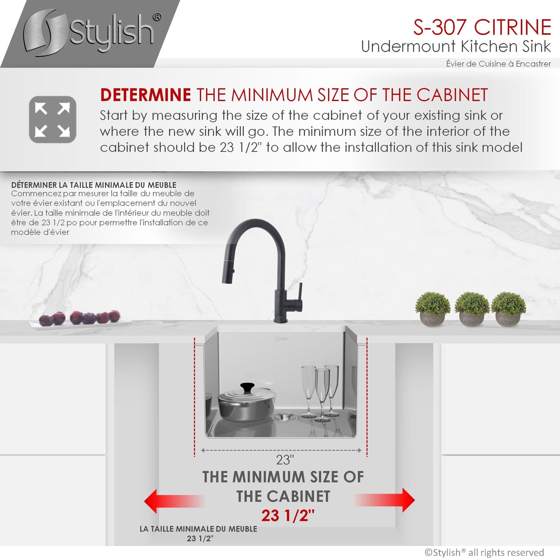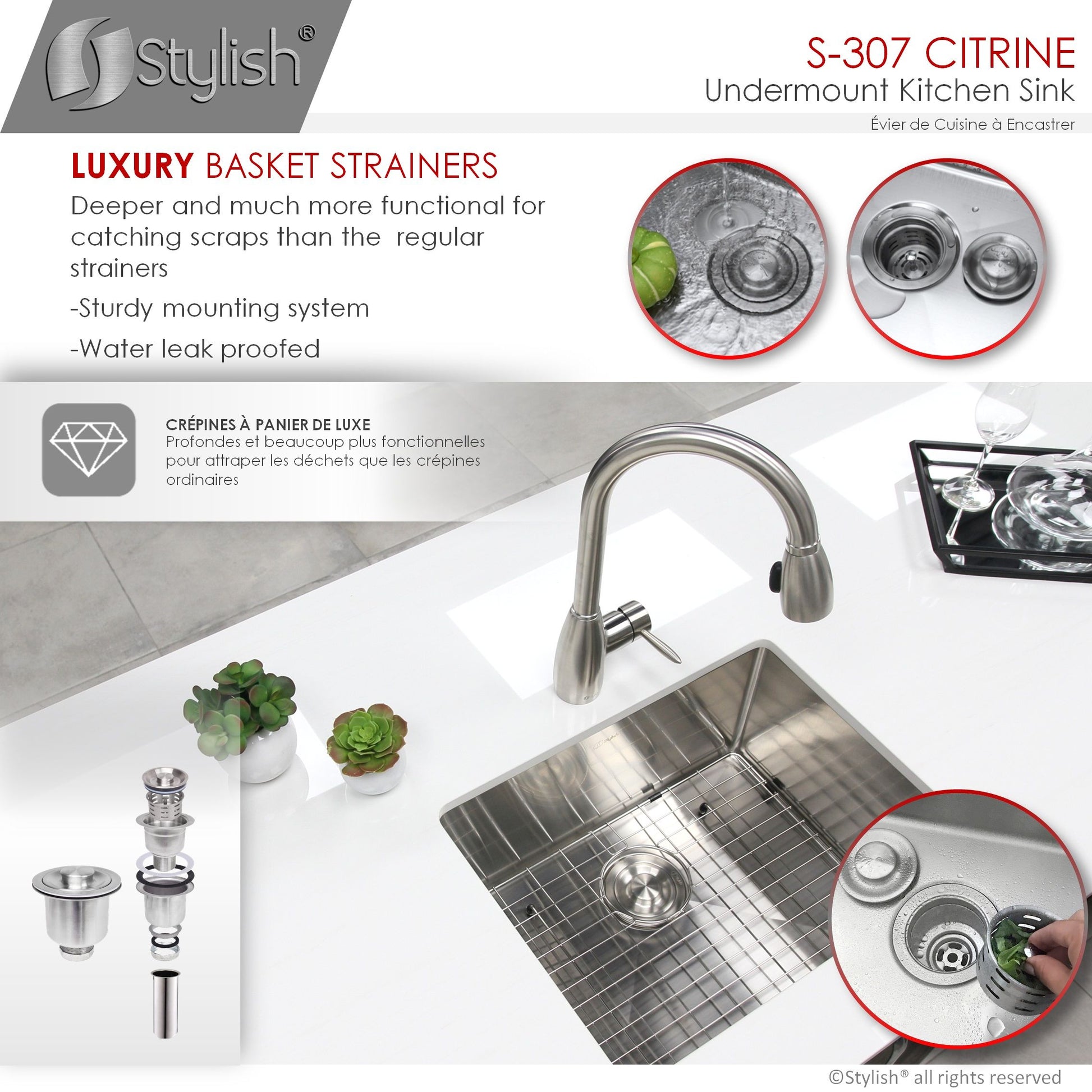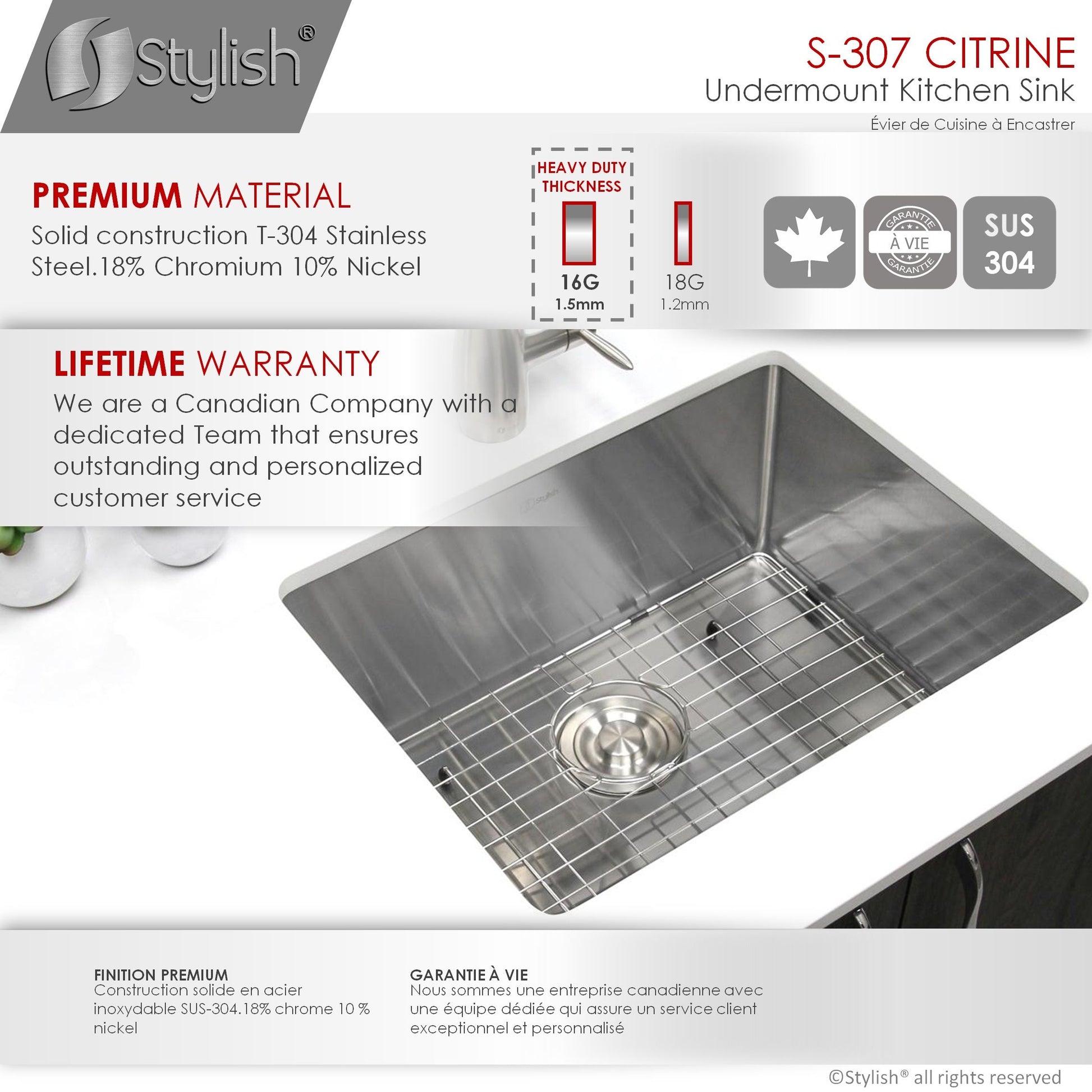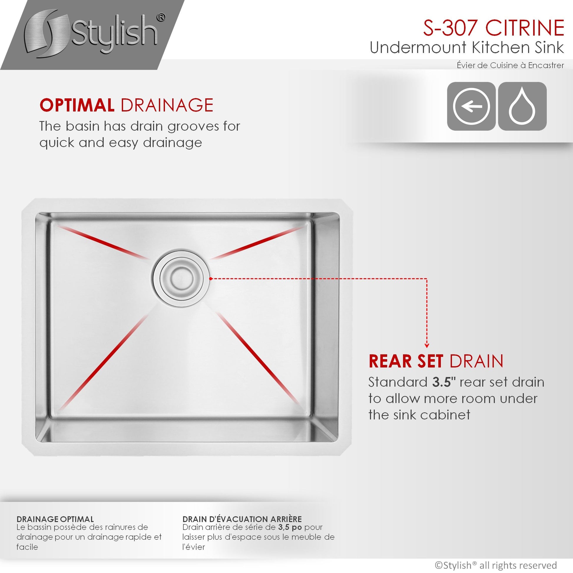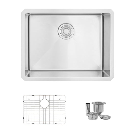 This 23 x 18 single bowl undermount stainless steel kitchen sink is perfect for your kitchen. The sink will give your space a luxurious look thanks to its modern style and rectangular shape. Handmade of surgical grade SUS 304 16G stainless steel, this sleek and luxurious kitchen sink with a brushed satin finish will look amazing in your kitchen! Even after years of constant use, the patina finish of the kitchen sink will never oxidize. The X-pattern drain grooves in this undermount kitchen sinks basin allow for optimal drainage. the undermount sink will drain and dry quickly and effortlessly. Also, the 10mm radius sink corners are smooth and easy to clean, so that your sink will always be shiny and free of bacteria and unpleasant smells. The stainless steel undermount kitchen sink will not only give your space a luxurious look, it will make your life easier.