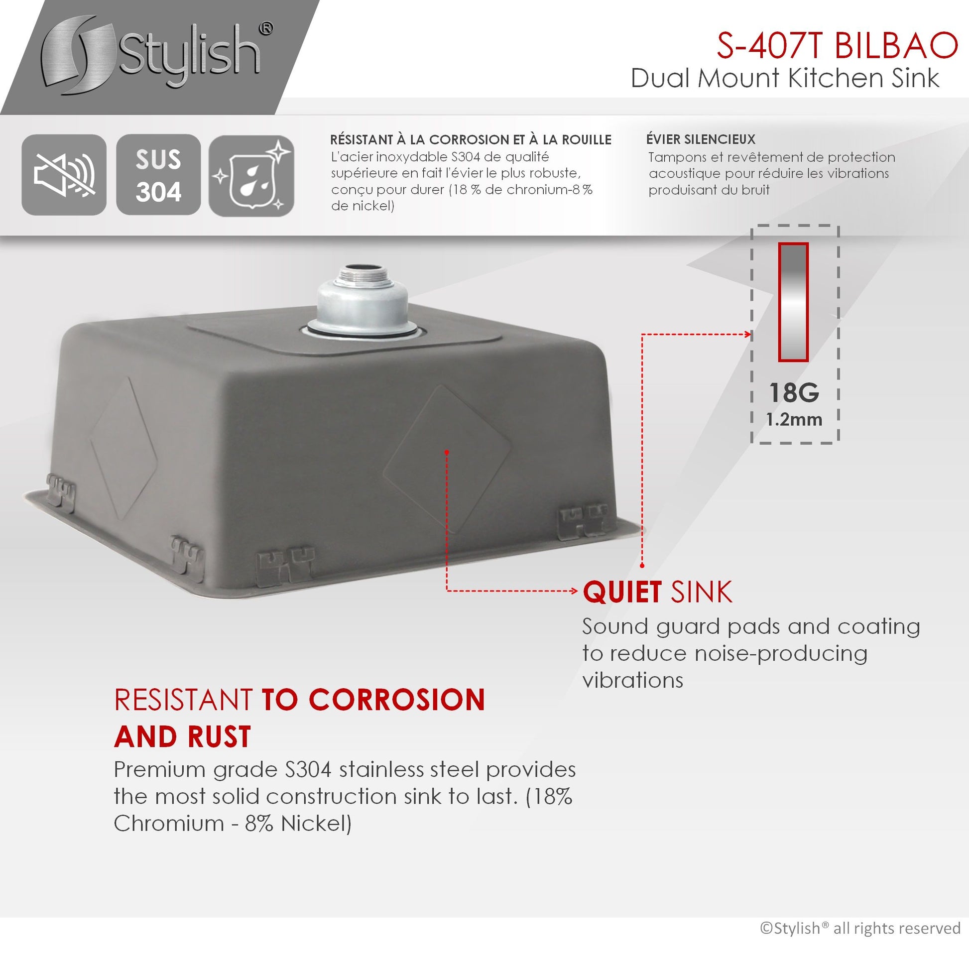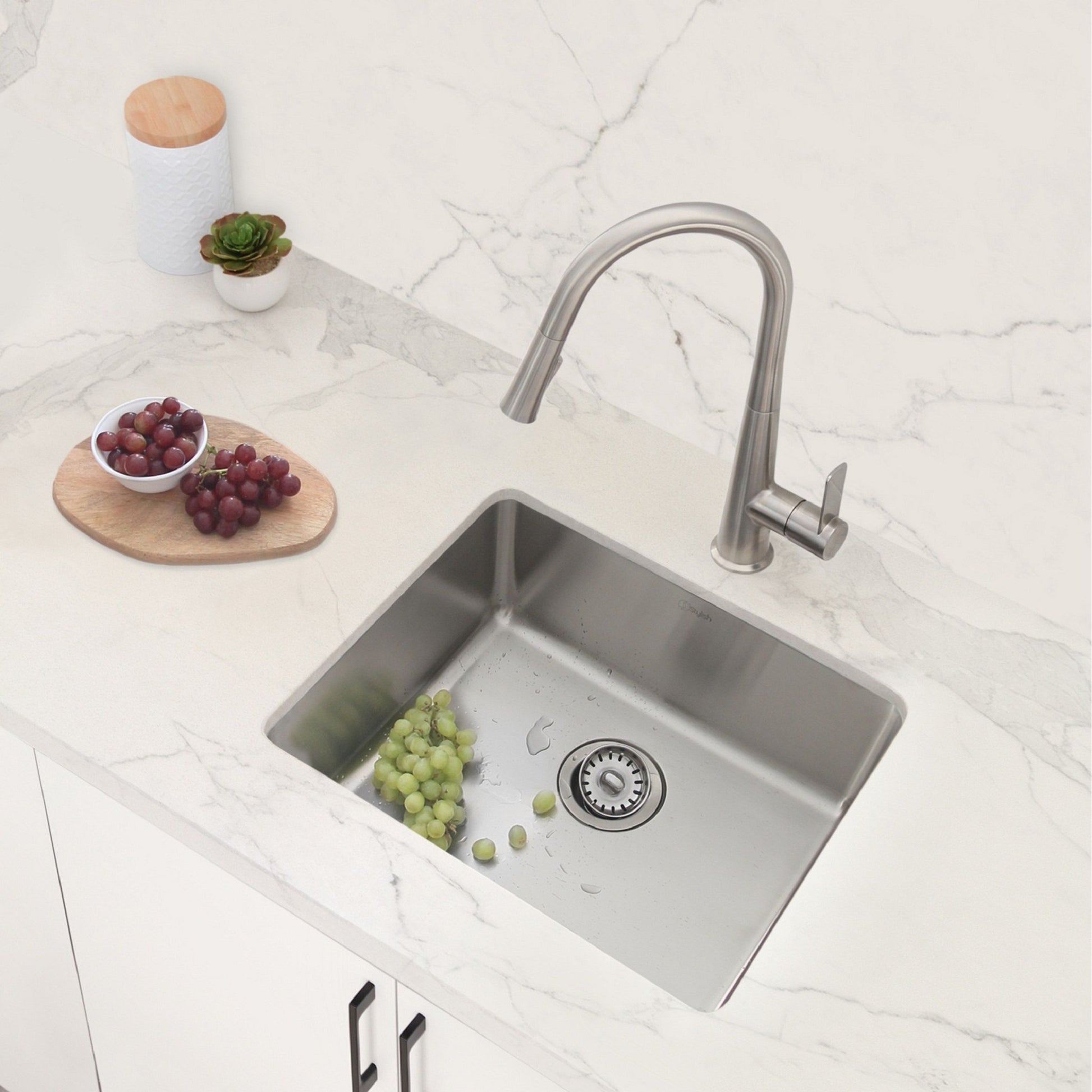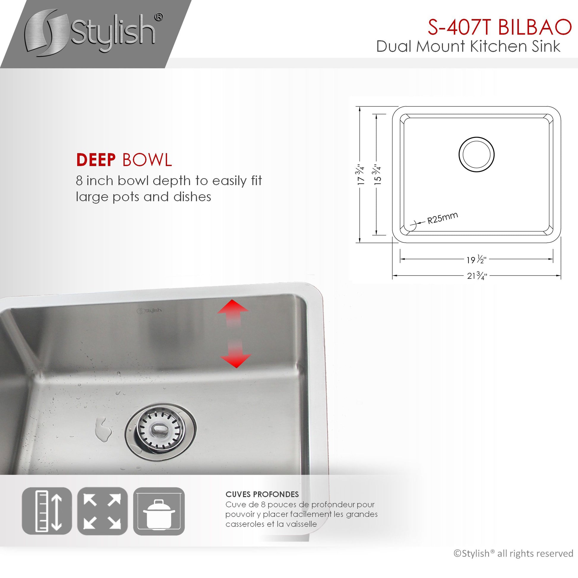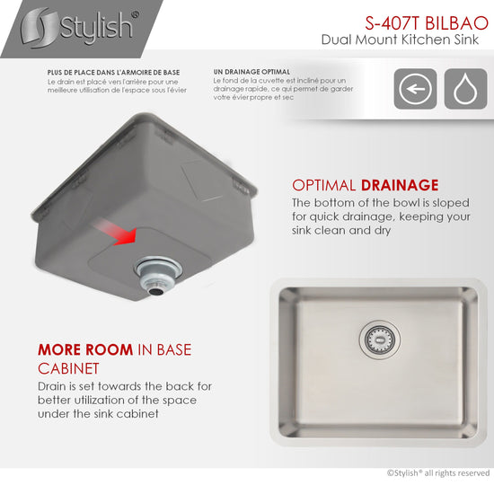 Our newest sink series brings style and functionality to your kitchen. This 22 single bowl undermount/drop-in stainless-steel kitchen sink is perfect for any kitchen style. Made from premium 18 gauge SUS 304 stainless steel, it is very durable and stylish. This sink will resist scratches and rusting. The beautiful satin finish completes the look of this stainless-steel kitchen sink. This great sink has 25mm radius corners for easy cleaning. These smooth corners also make it easy when cutting stone for your kitchen countertop around the sink. This single bowl kitchen sink is perfect for any kitchen renovation project. Covered with sound absorption pads on all sides of the sink, this is a very quiet sink. The guard pads also protect your kitchen cabinets from condensation. This undermount or drop-in sink is also equipped with a drain that is set to the rear of the sink, giving you more space under the kitchen cabinet sink for storage and providing optimal drainage.
