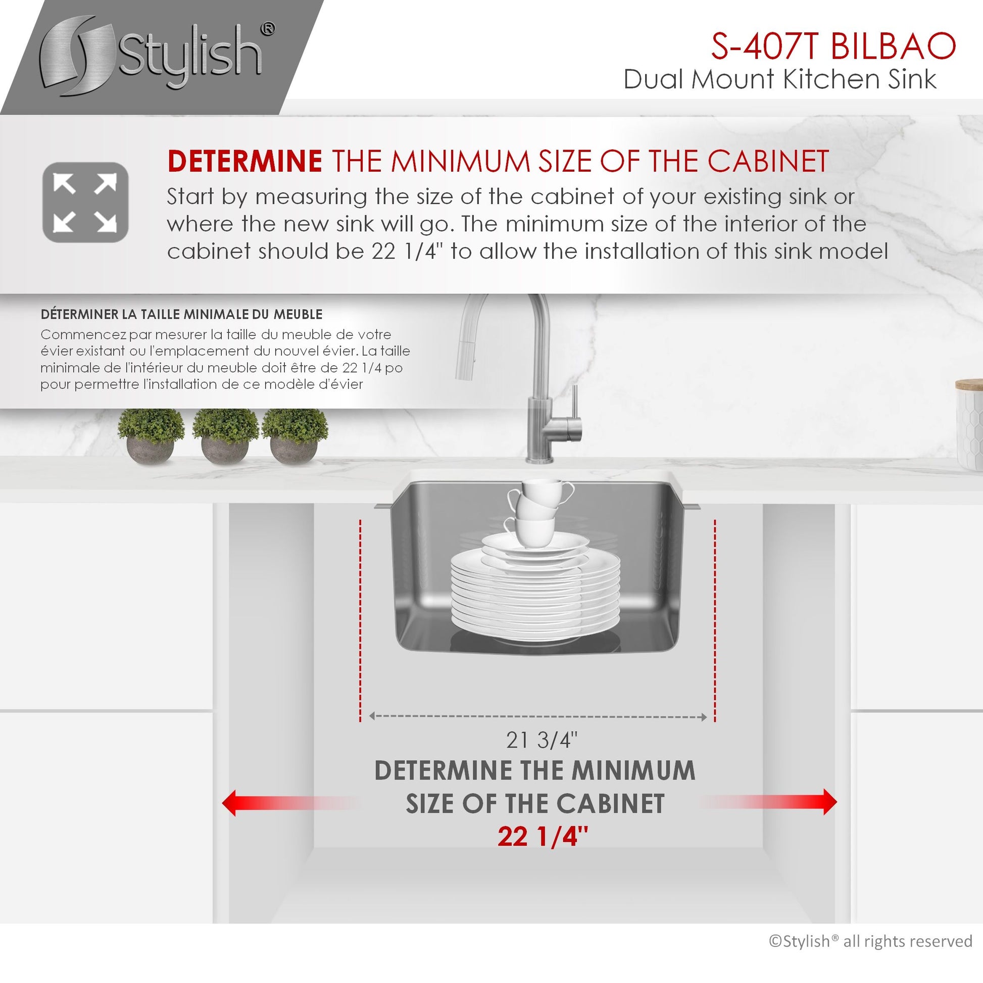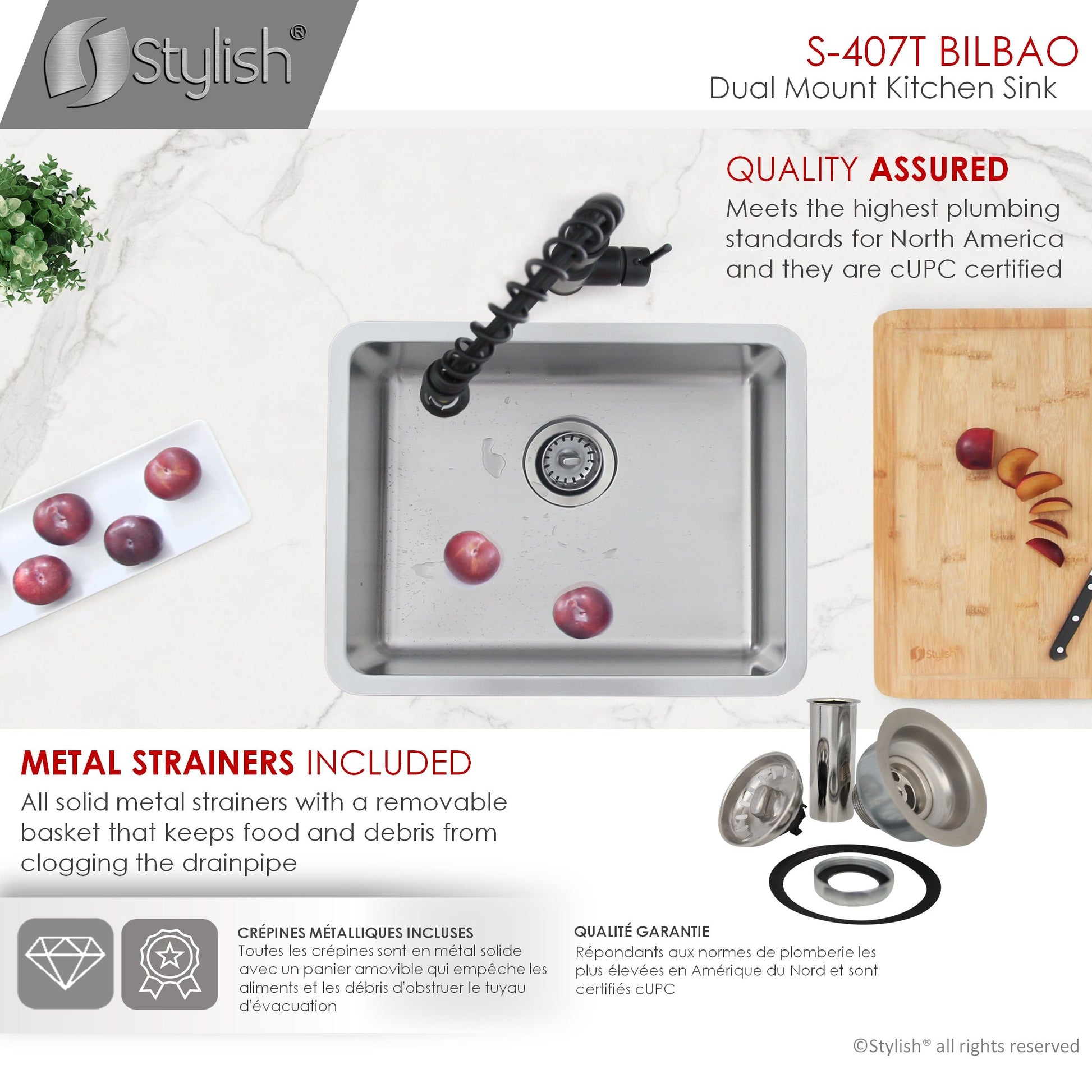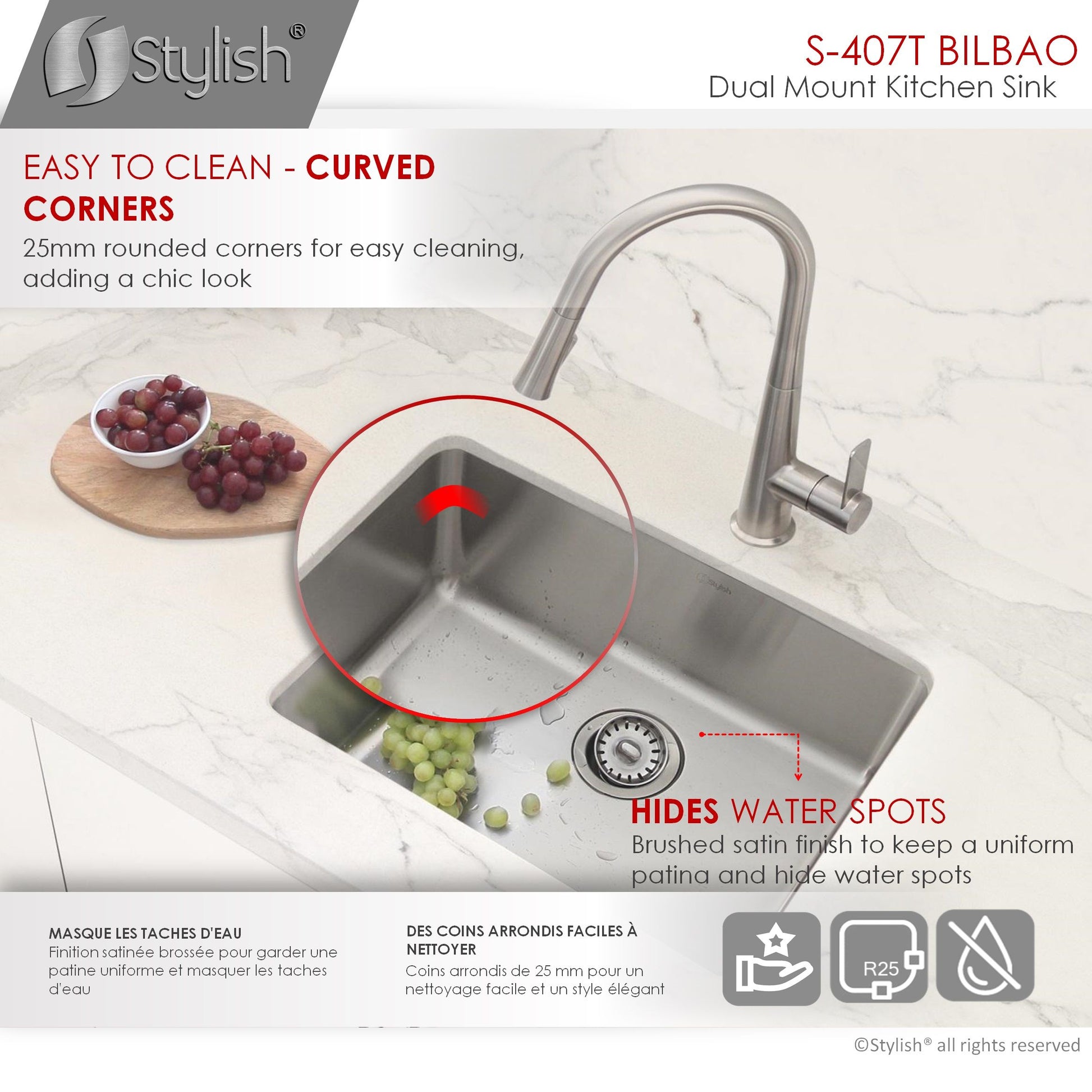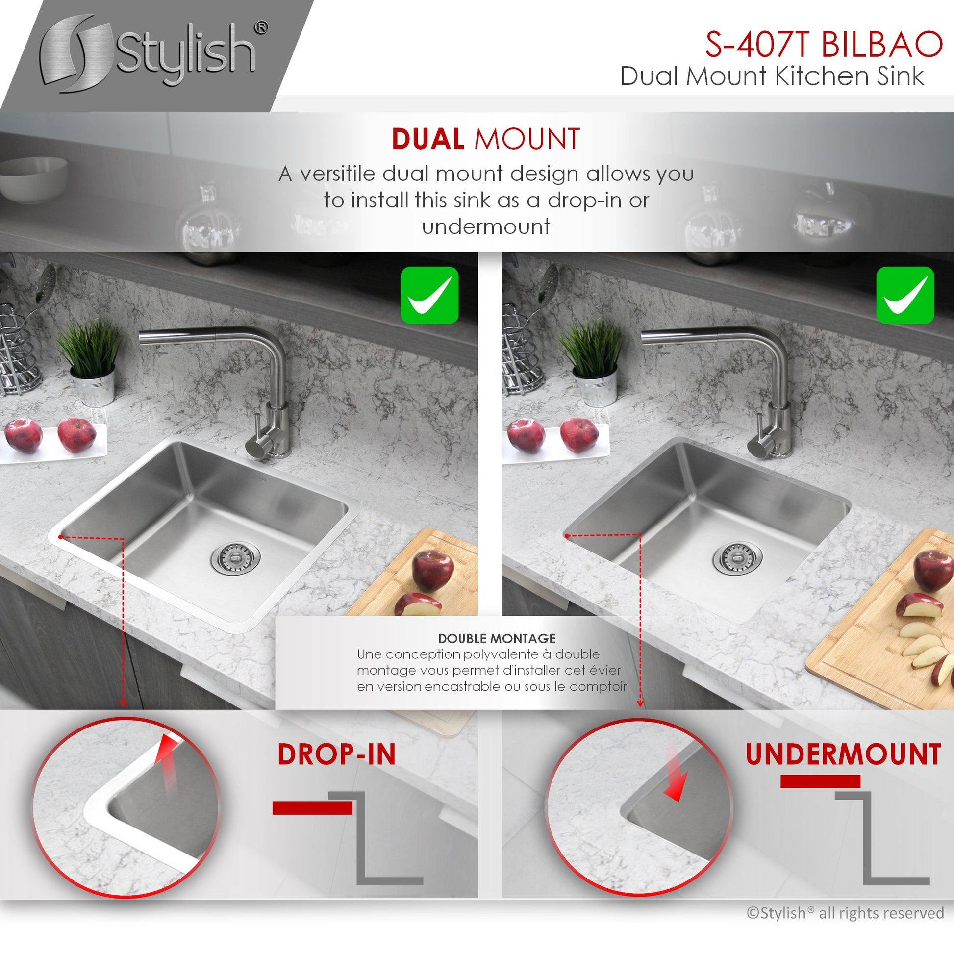 Our newest sink series brings style and functionality to your kitchen. This 22 single bowl undermount/drop-in stainless-steel kitchen sink is perfect for any kitchen style. Made from premium 18 gauge SUS 304 stainless steel, it is very durable and stylish. This sink will resist scratches and rusting. The beautiful satin finish completes the look of this stainless-steel kitchen sink. This great sink has 25mm radius corners for easy cleaning. These smooth corners also make it easy when cutting stone for your kitchen countertop around the sink. This single bowl kitchen sink is perfect for any kitchen renovation project. Covered with sound absorption pads on all sides of the sink, this is a very quiet sink. The guard pads also protect your kitchen cabinets from condensation. This undermount or drop-in sink is also equipped with a drain that is set to the rear of the sink, giving you more space under the kitchen cabinet sink for storage and providing optimal drainage.