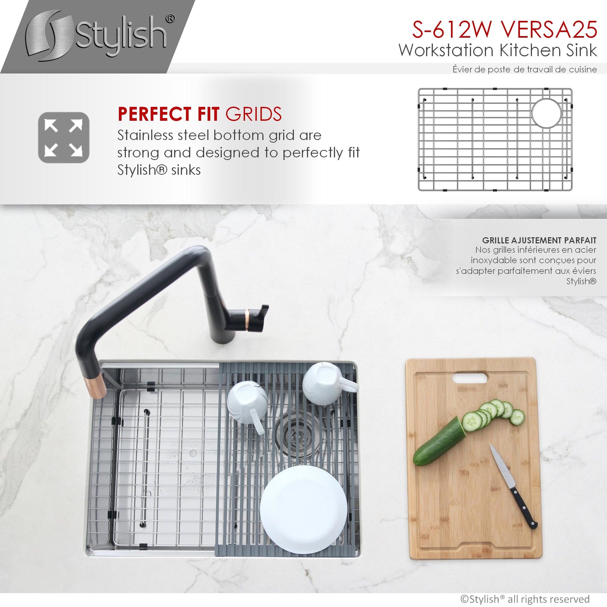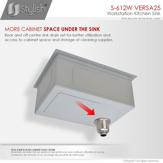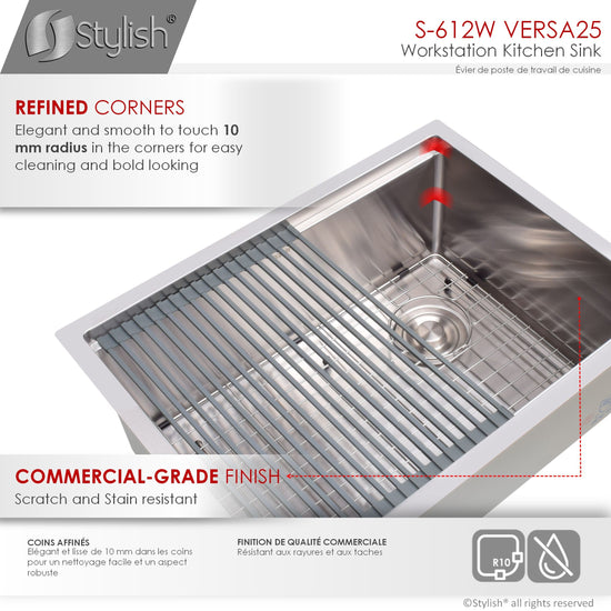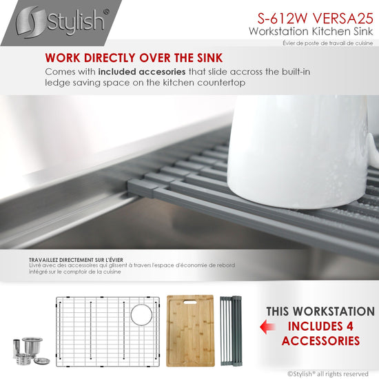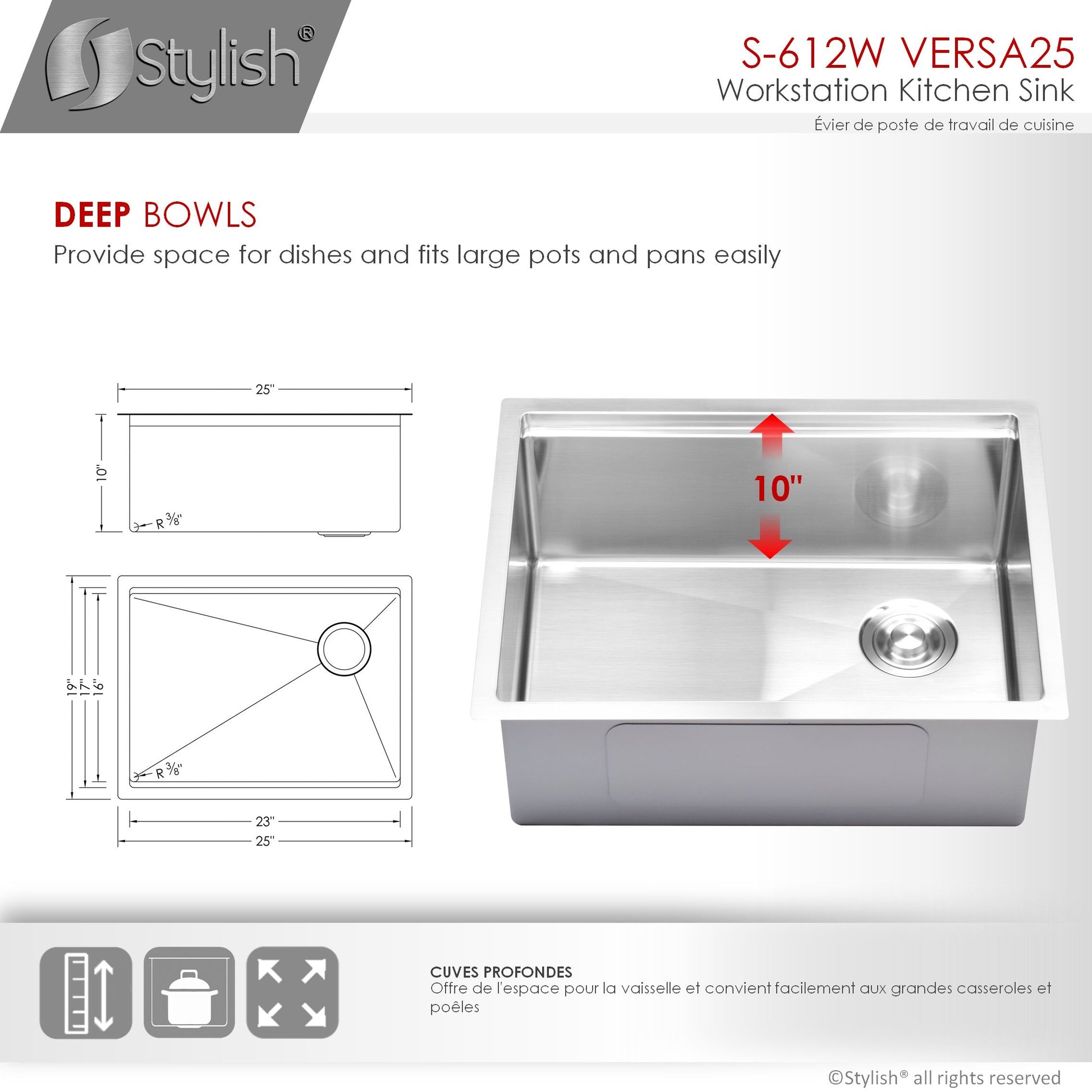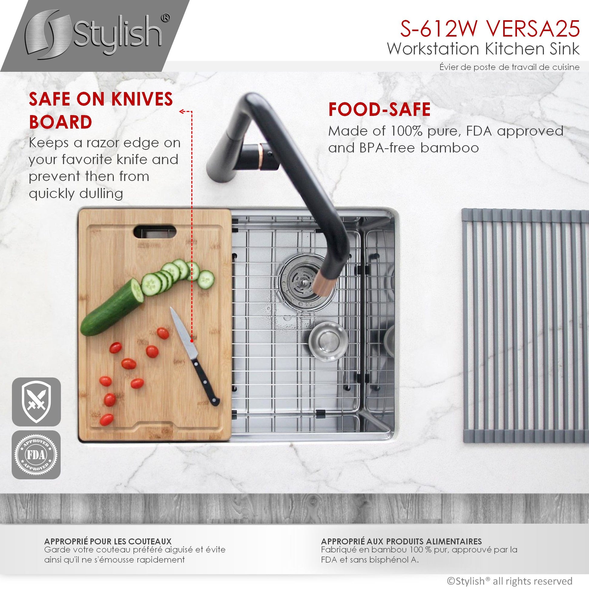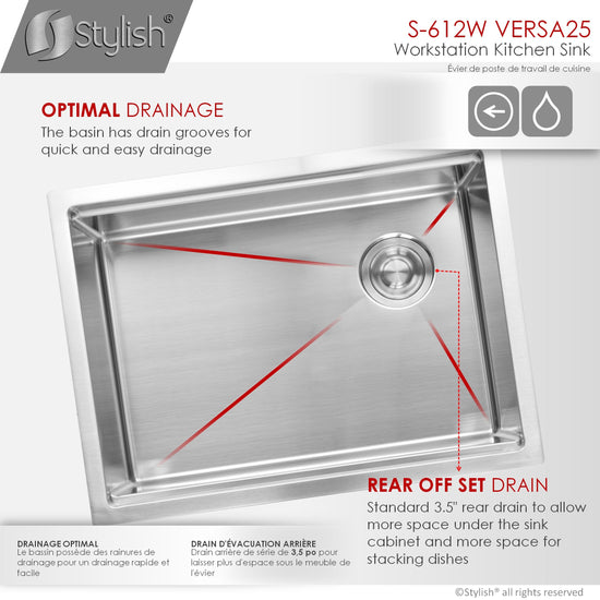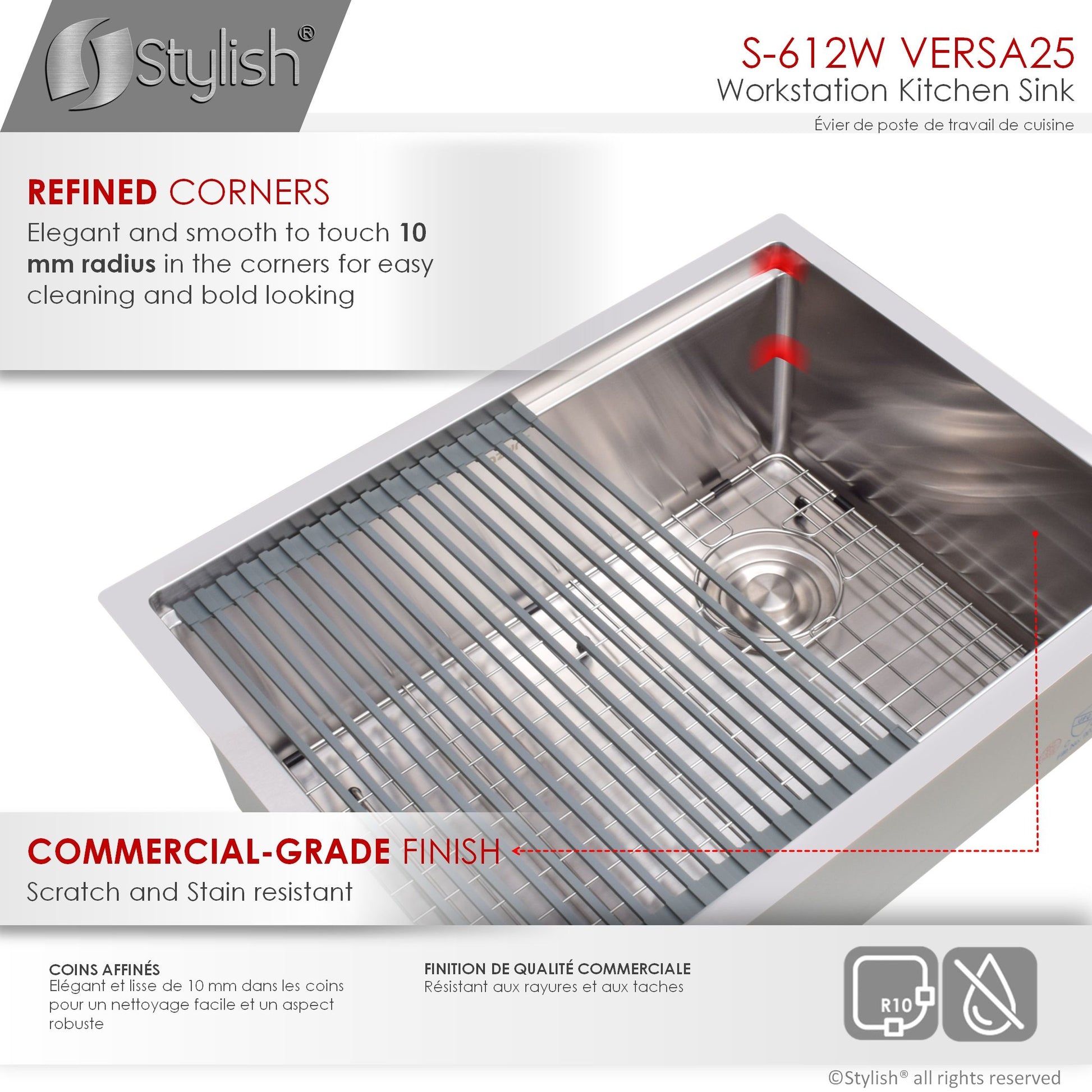 Adding style and functionality to your kitchen has never been easier with the amazing Versa25 kitchen sink workstation which includes one 25x19 single bowl undermount stainless steel kitchen sink, one protective stainless steel bottom grid, one ledge sink steel-silicone coated drying rack, one perfect fit bamboo cutting board. This workstation sink comes with the ledge on the longer sides of the sink. This ledge allows the kitchen sink accessories to perfectly fit making it a unique and functional experience. The undermount stainless steel kitchen sink features not only a rear set drain, but the drain is also set to the rear right corner of the kitchen sink, this is a brilliant feature that truly allows maximum space under the kitchen cabinet, sink bottom is designed with small slope and grooves for efficient water drainage.