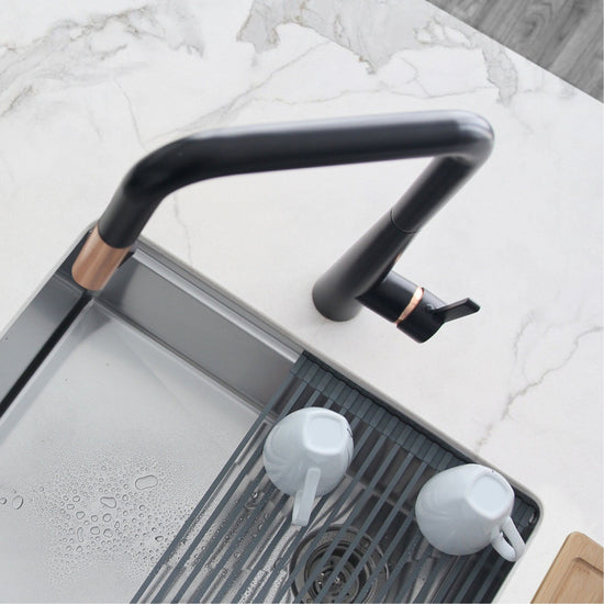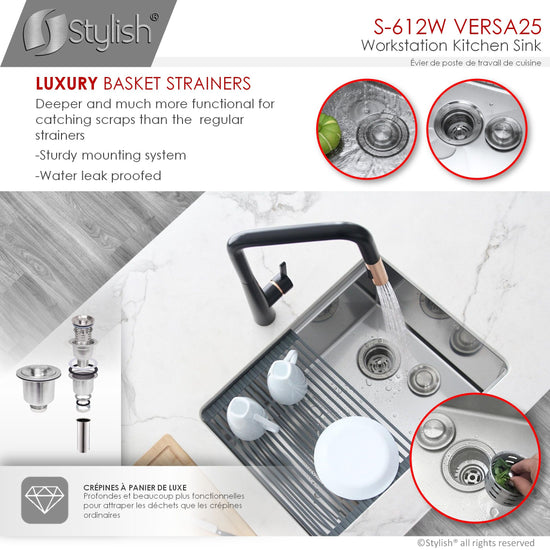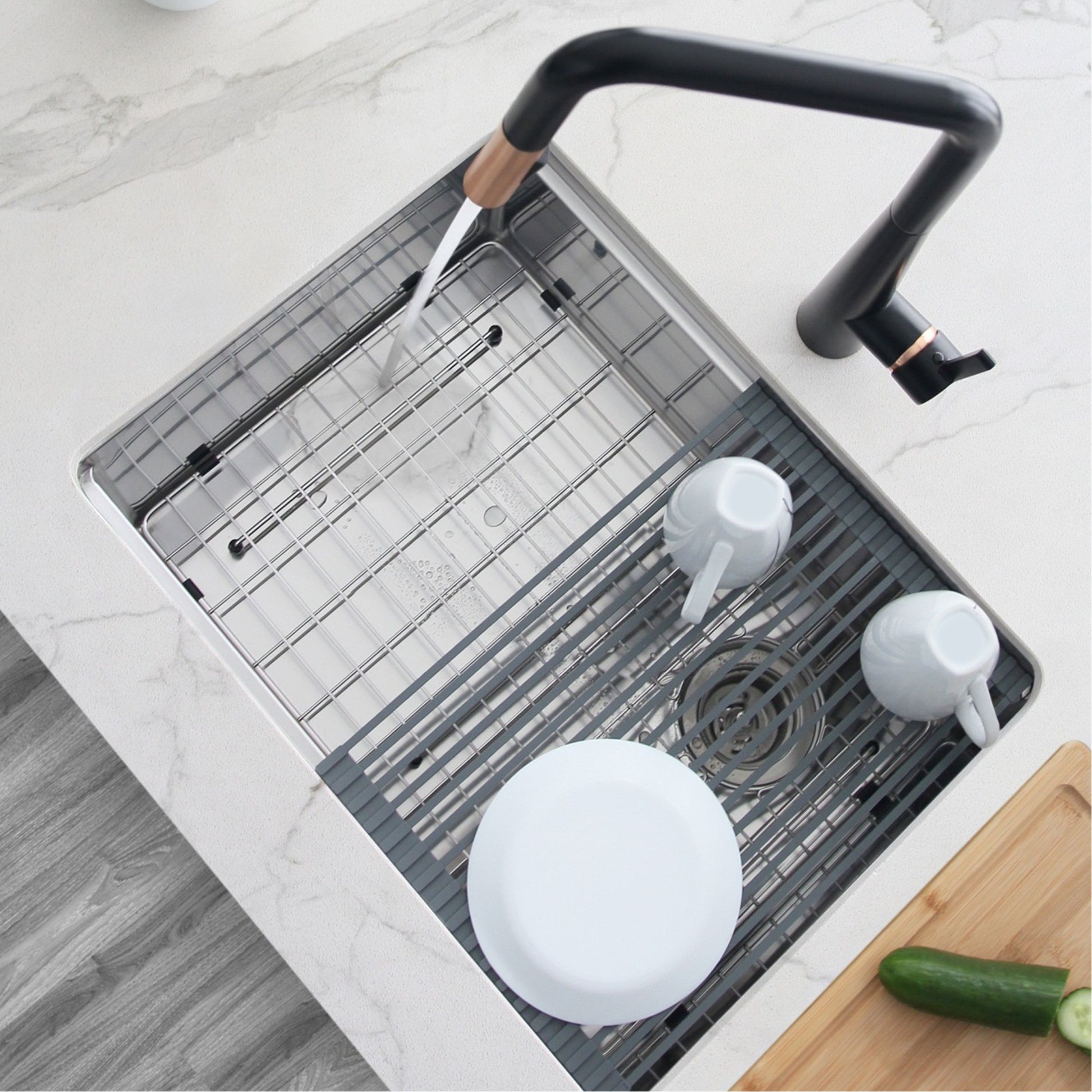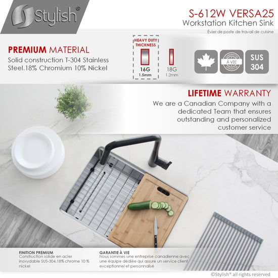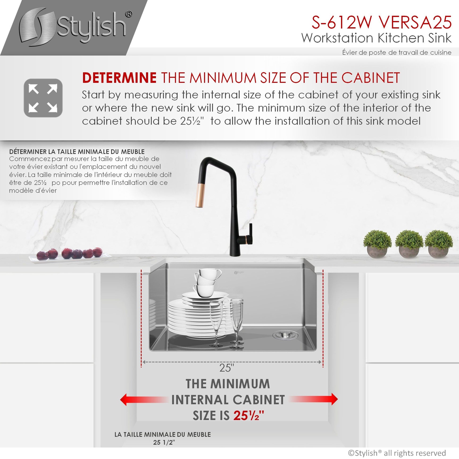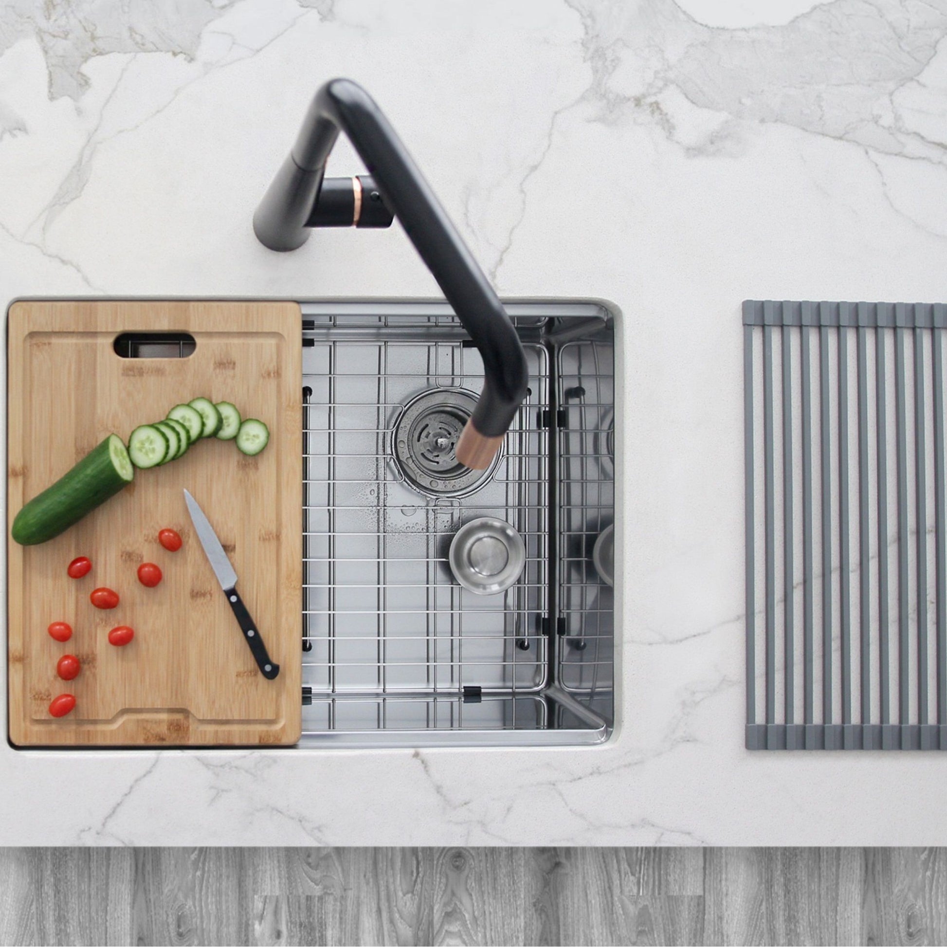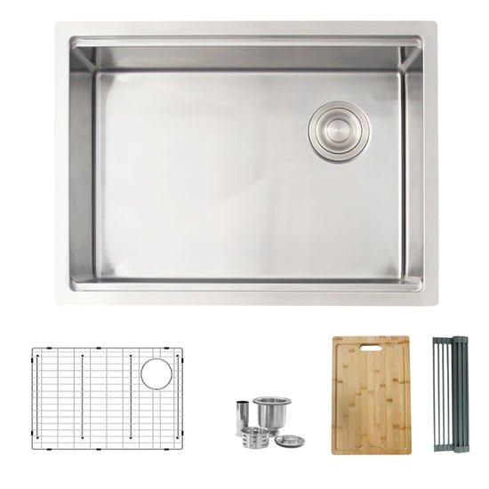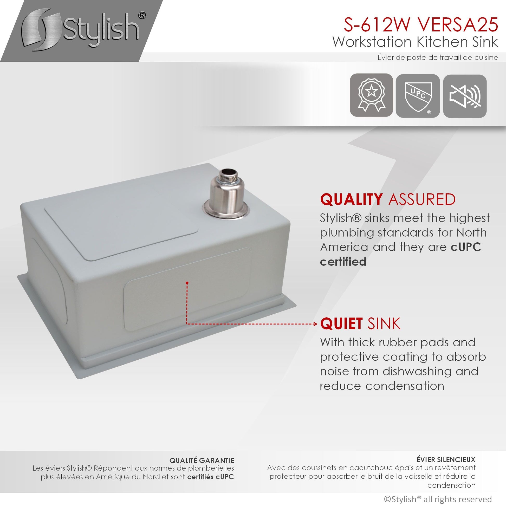 Adding style and functionality to your kitchen has never been easier with the amazing Versa25 kitchen sink workstation which includes one 25x19 single bowl undermount stainless steel kitchen sink, one protective stainless steel bottom grid, one ledge sink steel-silicone coated drying rack, one perfect fit bamboo cutting board. This workstation sink comes with the ledge on the longer sides of the sink. This ledge allows the kitchen sink accessories to perfectly fit making it a unique and functional experience. The undermount stainless steel kitchen sink features not only a rear set drain, but the drain is also set to the rear right corner of the kitchen sink, this is a brilliant feature that truly allows maximum space under the kitchen cabinet, sink bottom is designed with small slope and grooves for efficient water drainage.